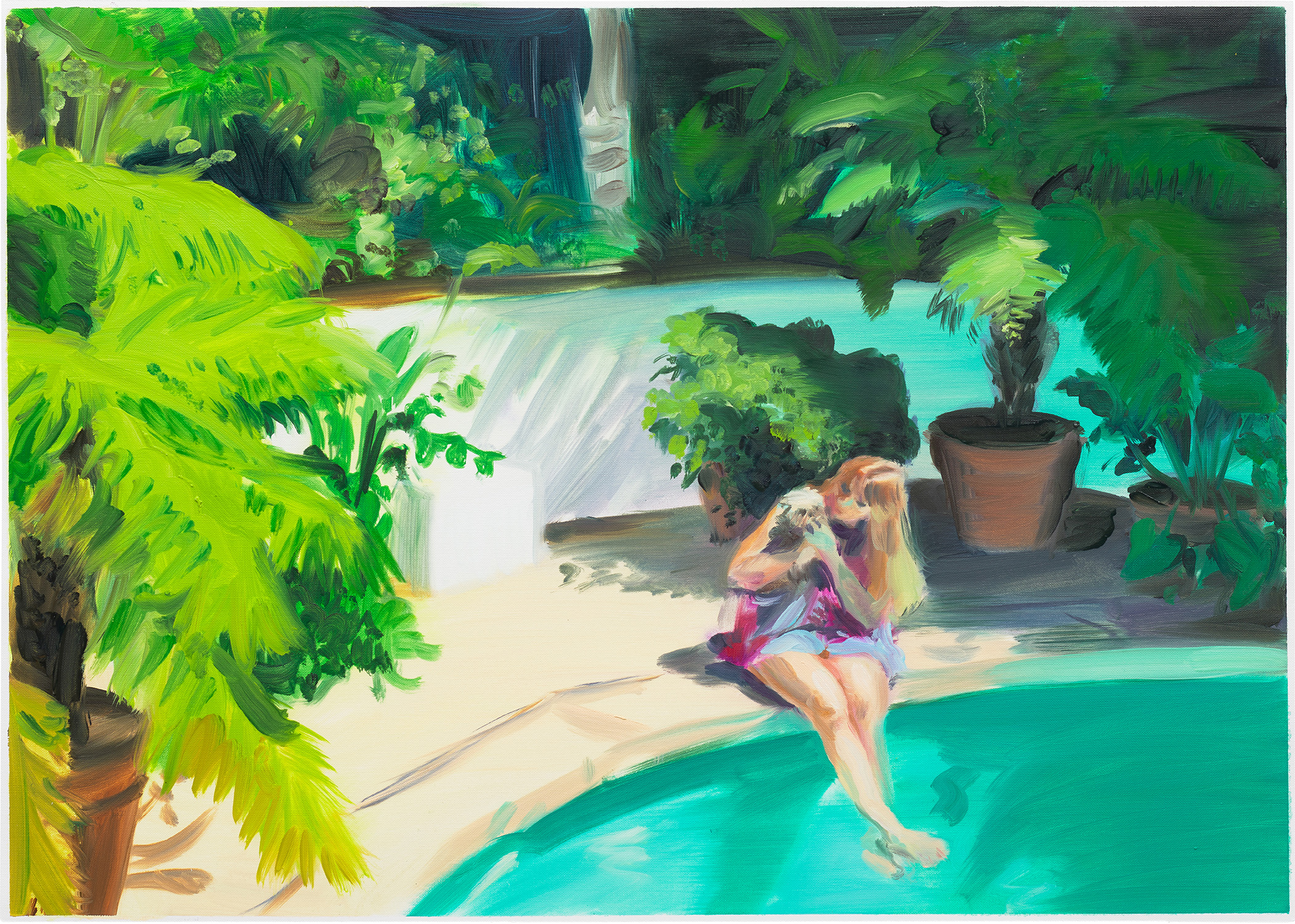 Caroline Walker's oil on paper work from 2018 titled 'Doggy Paddle' explores themes suggested by its evocative title. The piece combines Walker's characteristic painterly style with intimate subject matter.