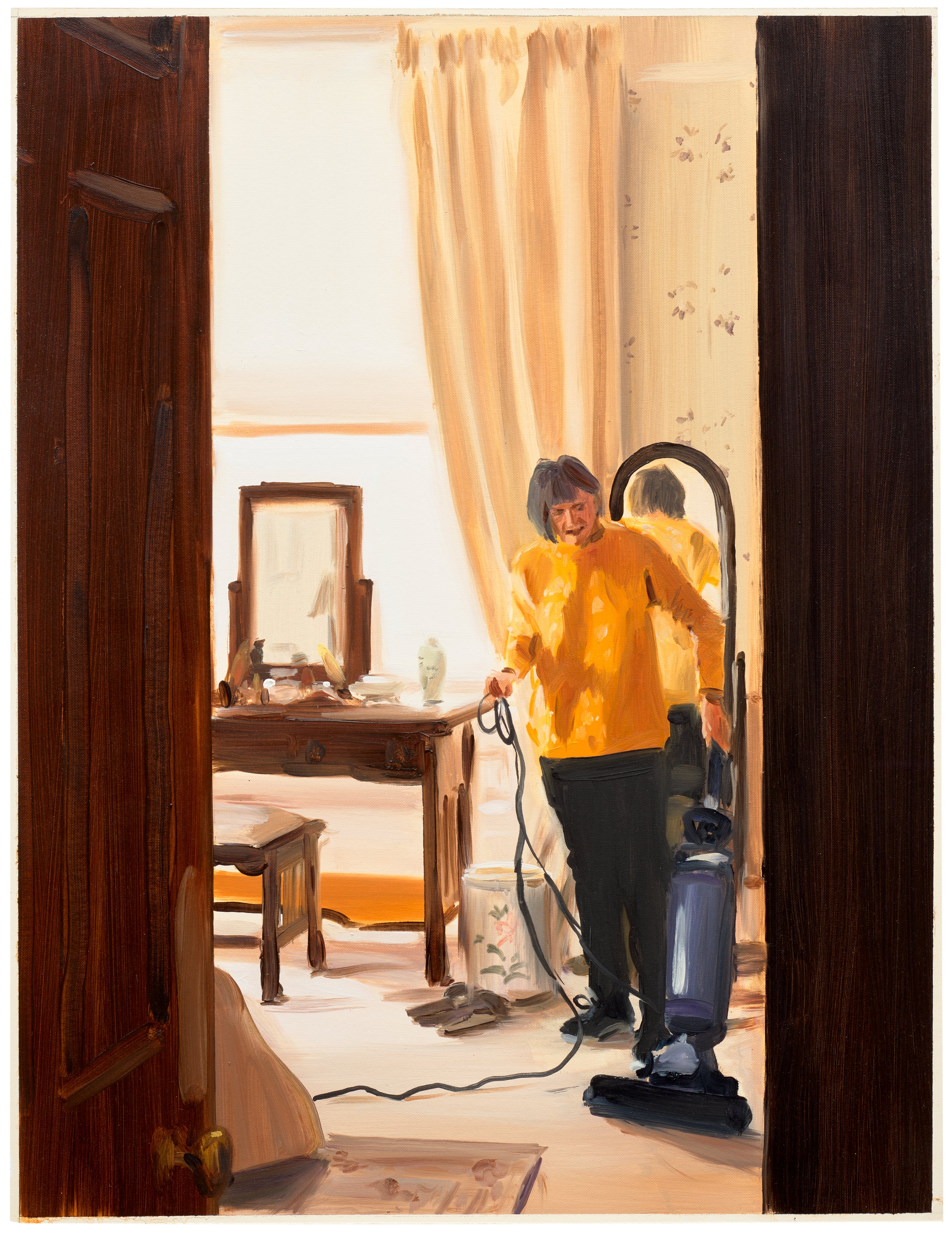 A luminous interior scene rendered in oil on paper, capturing a solitary woman engaged in the mundane domestic act of vacuuming in the cool, diffused light of a December morning. Walker's loose yet confident brushwork conveys a sense of quiet intimacy, bathing the figure and her surroundings in the muted, bluish tones characteristic of winter daylight filtering through unseen windows. The work reflects the artist's ongoing exploration of women in private spaces, elevating an overlooked everyday moment into something contemplative and visually compelling.