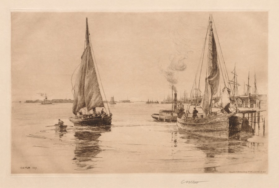 Rendered with delicate linear precision characteristic of American etching revival, this maritime scene demonstrates Platt's skill in capturing atmospheric effects on water before he became famous as a landscape architect.