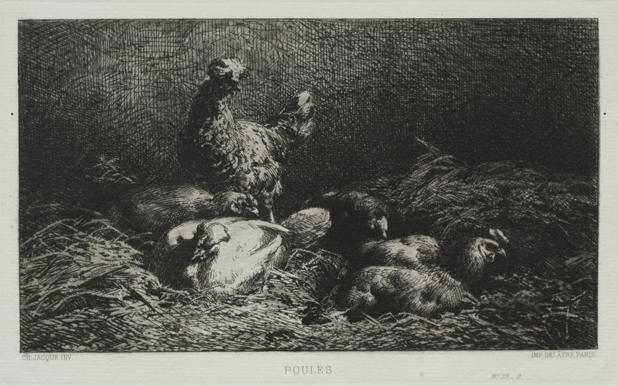 Barnyard fowl become the focus in this charming etching that demonstrates Jacque's keen observation of farm animals and his ability to find artistic merit in humble subjects.