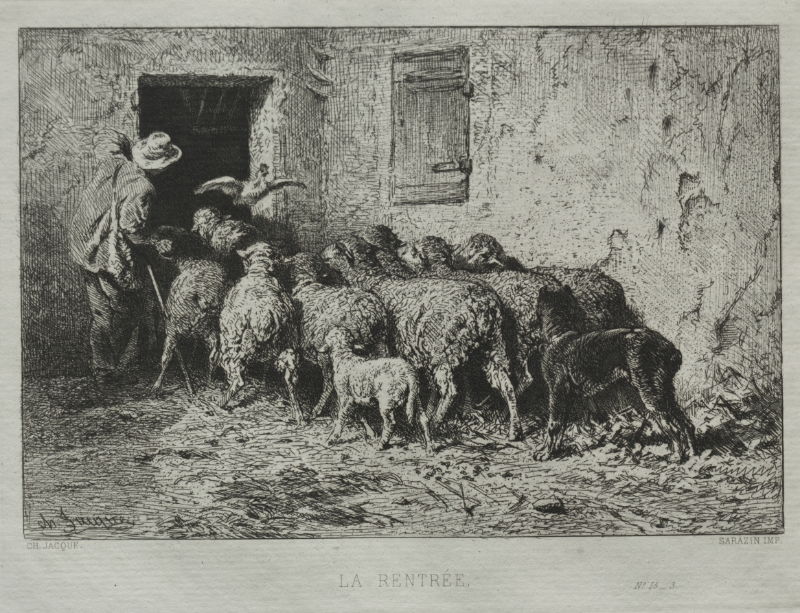 Evening homecoming provides the theme for this etching, capturing the cyclical nature of agricultural life that fascinated the Barbizon School artists.