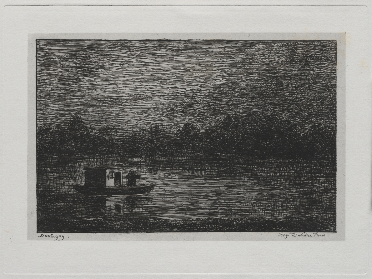 Enhanced with chine collé technique for added depth and texture, this nocturnal scene reflects Daubigny's fascination with working aboard his floating studio boat 'Le Botin.'