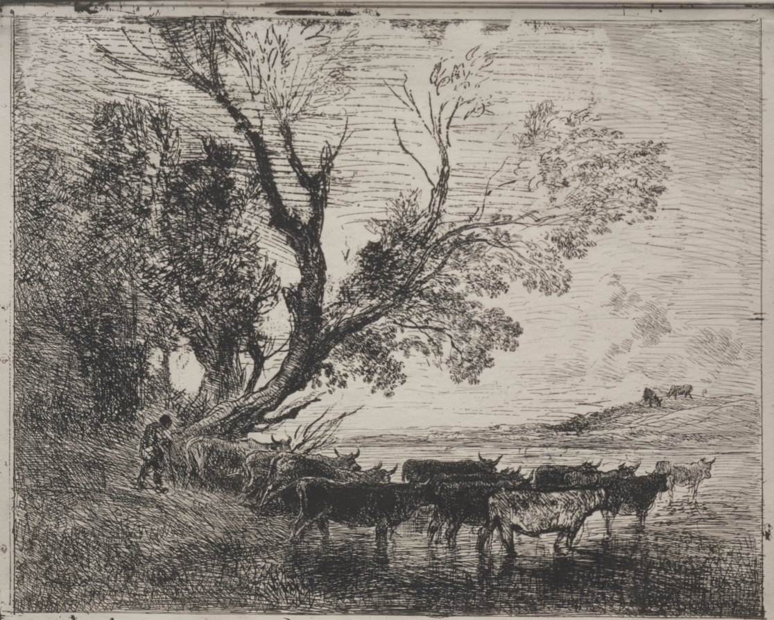 Utilizing the cliché-verre process, this riverside scene exemplifies Daubigny's role in bridging the gap between traditional landscape art and Impressionist innovations.
