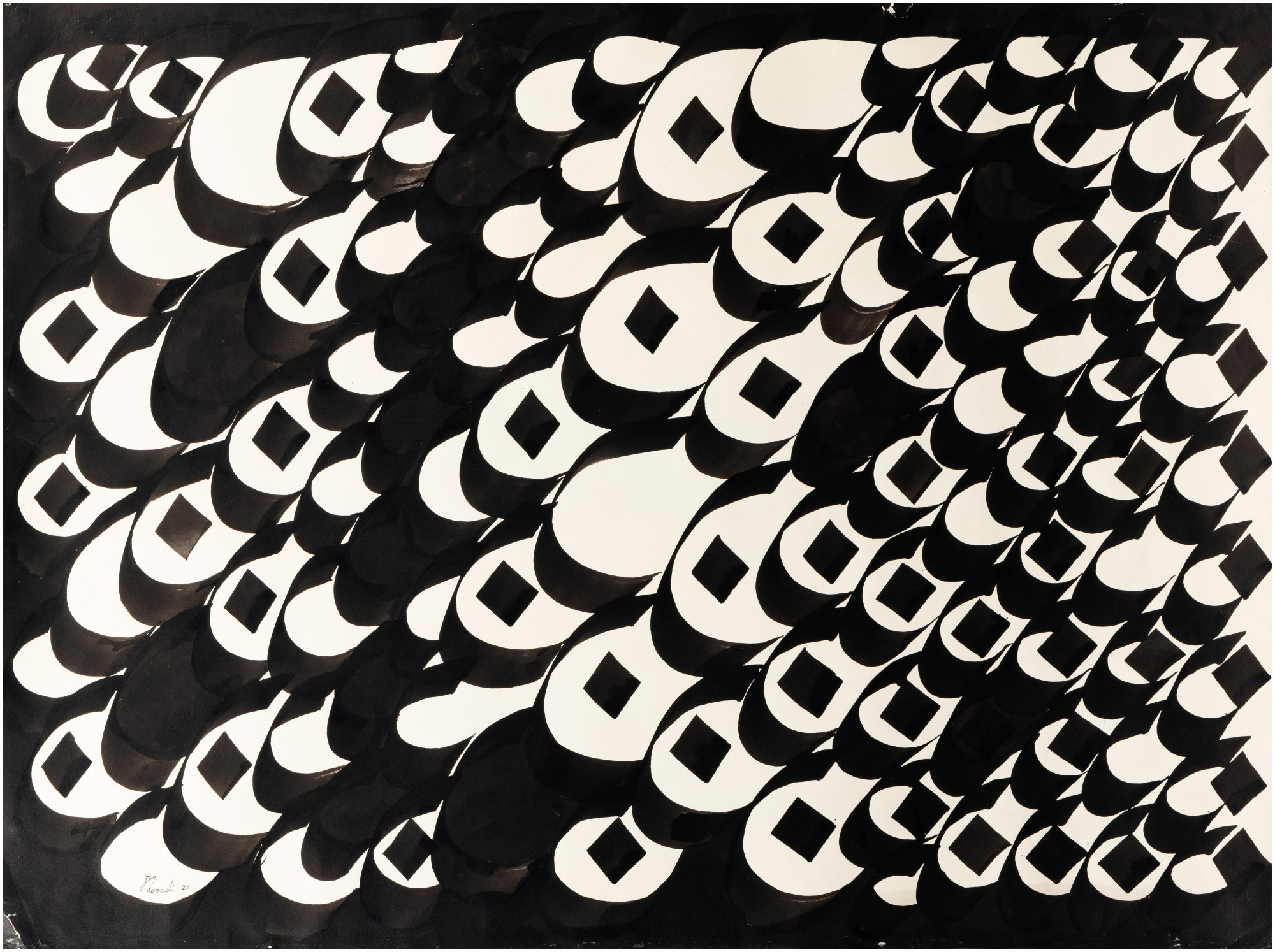 An ink work by Charles Hossein Zenderoudi executed on arjomari arches paper, a material significant to the artist's practice. The untitled composition demonstrates the artist's engagement with calligraphy and abstract ink mark-making.
