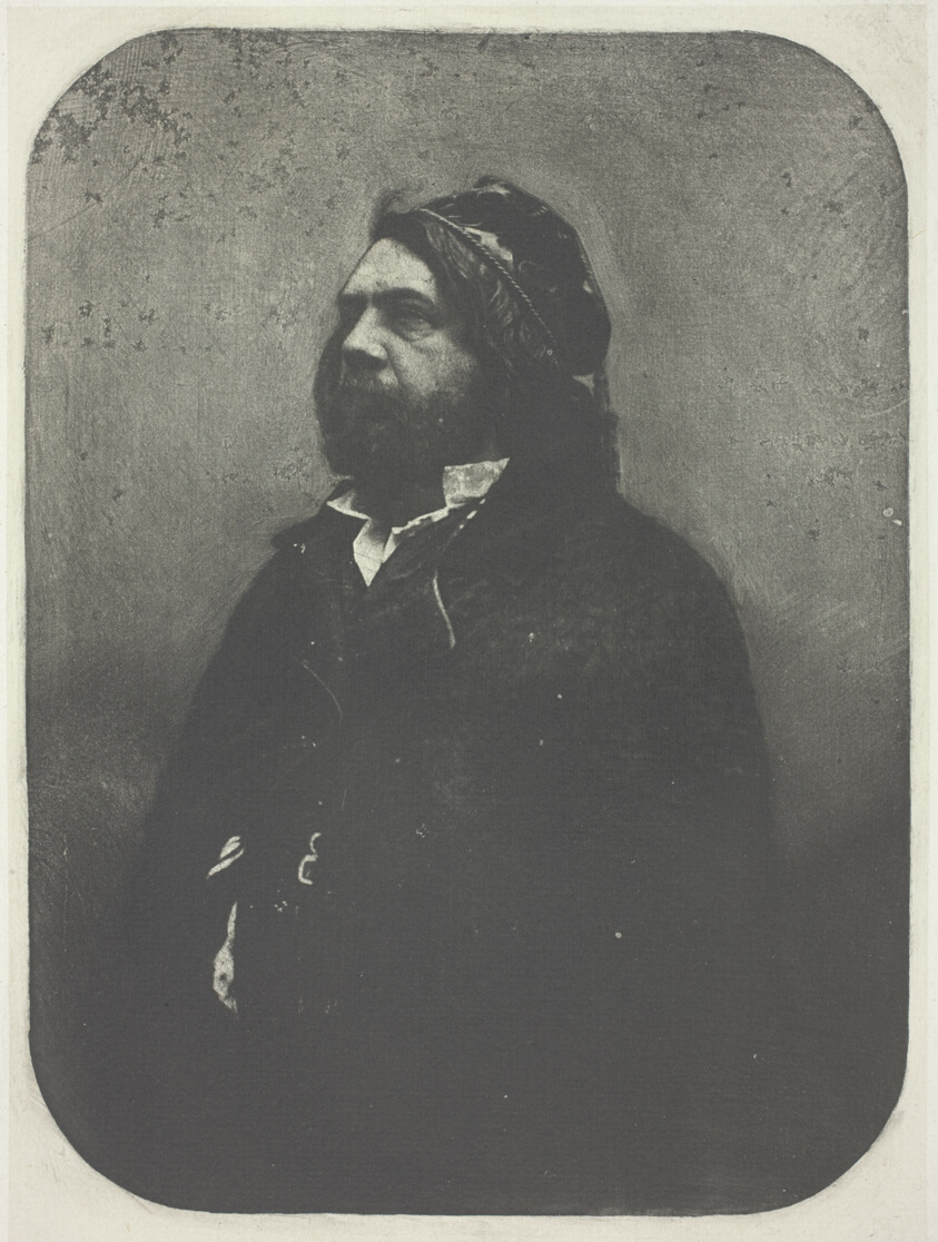 A photogravure after Nadar's original photograph, demonstrating Nègre's skill in translating photographic portraits into the more permanent and reproducible printmaking medium.