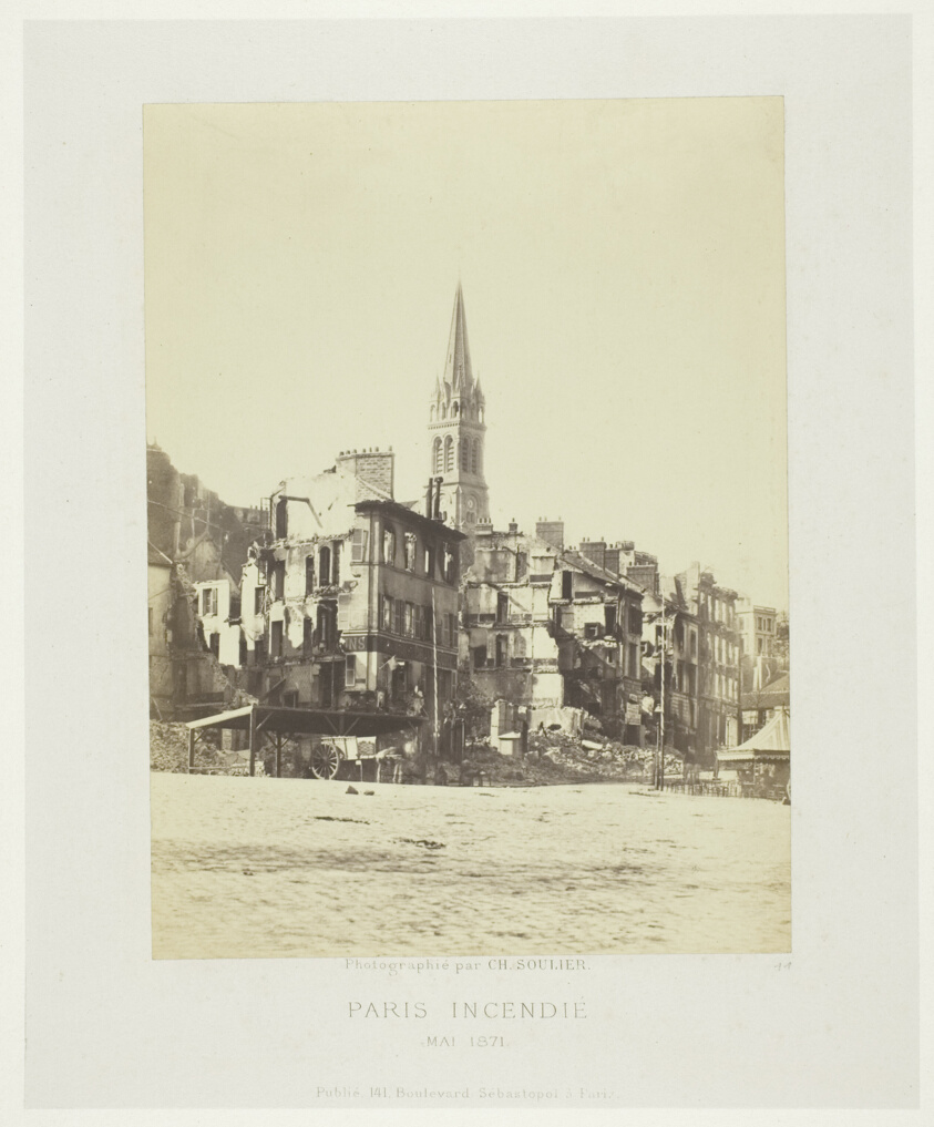 Rubble and devastation transform a once-elegant public space into a landscape of political tragedy, preserved through the documentary power of early photography.