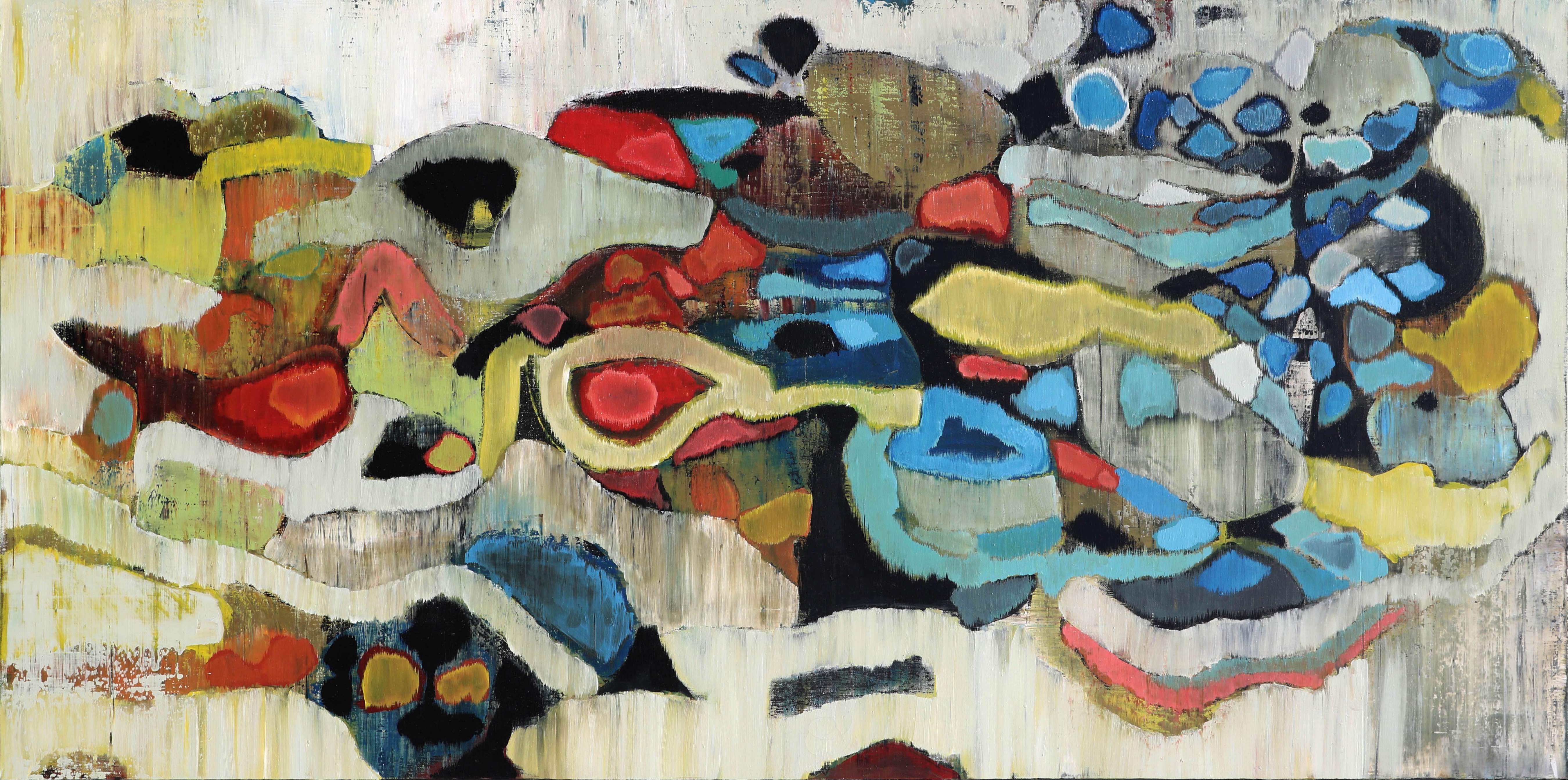 Winters creates abstract paintings that evoke biological and topographical systems through layered organic forms, much like Langford's cartographically inspired compositions. His dynamic use of rich color and complex interlocking shapes across broad canvases parallels the aerial terrain perspective found in Emerald Bay.
