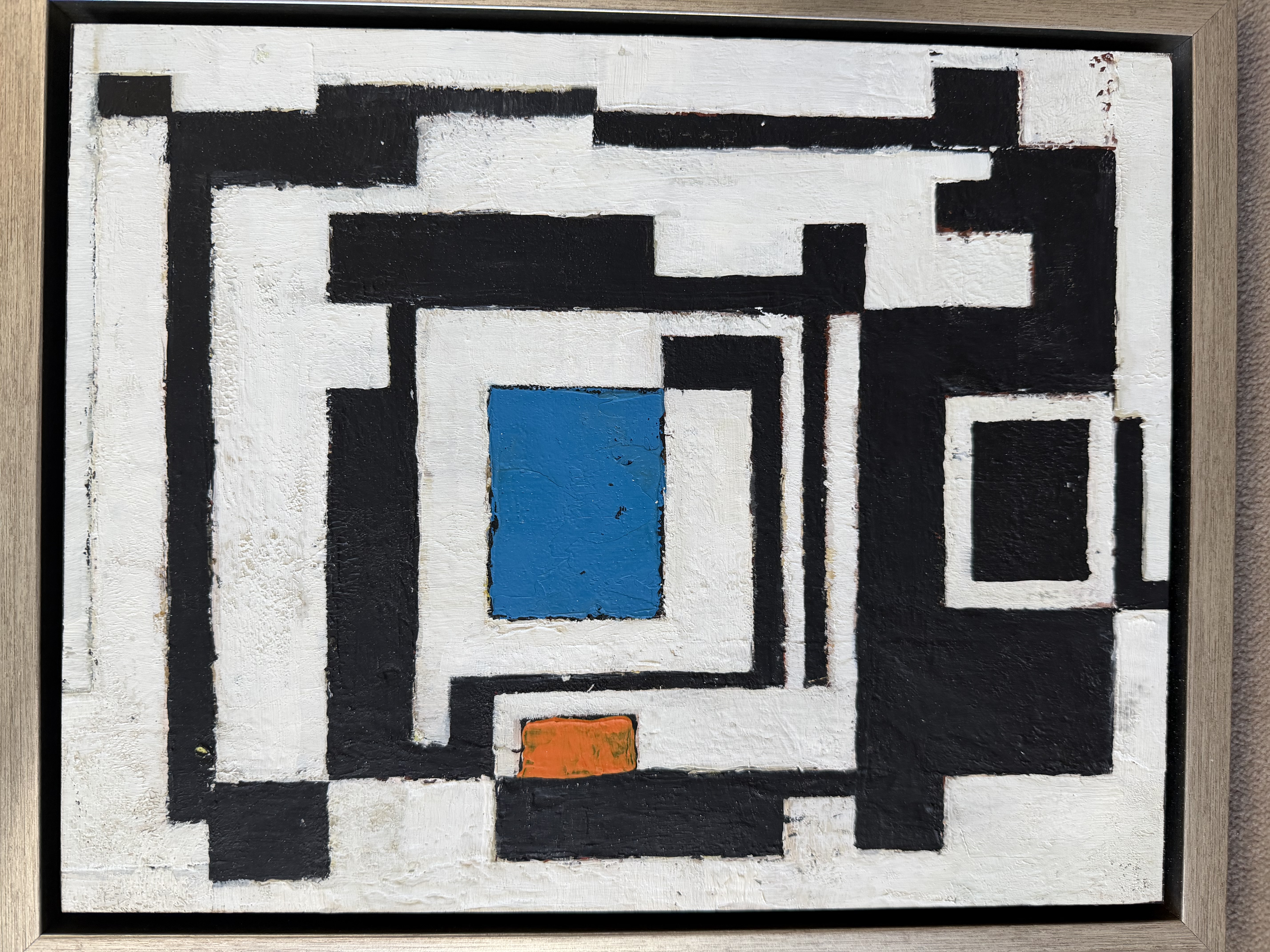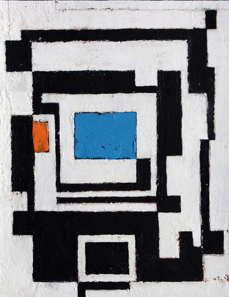 A striking geometric abstract composition featuring bold black rectilinear forms against white, punctuated by a vibrant blue square at center and a small orange rectangle to the left. The maze-like pattern creates dynamic visual pathways through interlocking rectangular shapes. The heavily textured surface shows evidence of thick paint application, characteristic of Langford's architectural approach to abstraction.