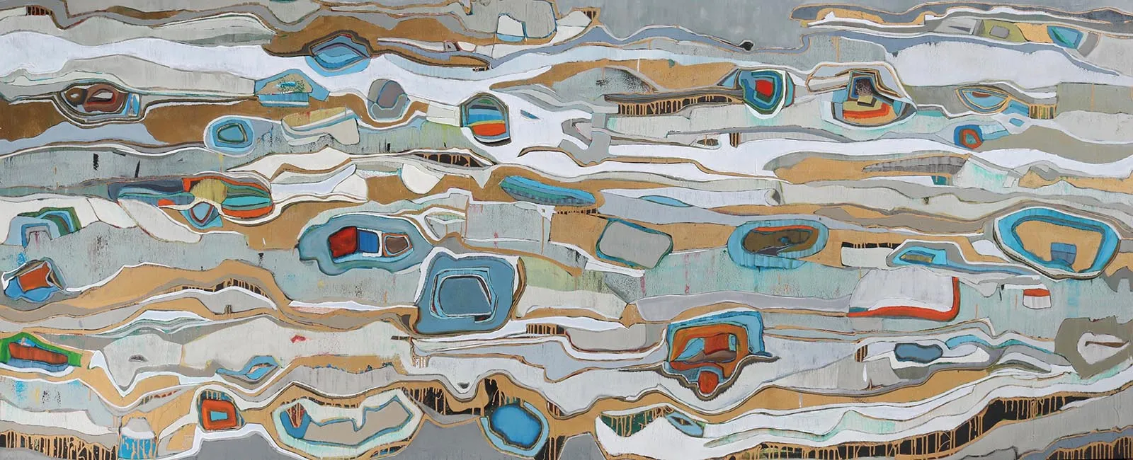 Morphic Panorama combines oil and bronze elements on canvas to create a multi dimensional landscape interpretation. The integration of bronze adds sculptural qualities to the painted surface, creating textural complexity and visual interest. The work suggests transformation and change within natural forms through its mixed media approach. This innovative technique merges traditional painting with sculptural materials to enhance the panoramic landscape theme.