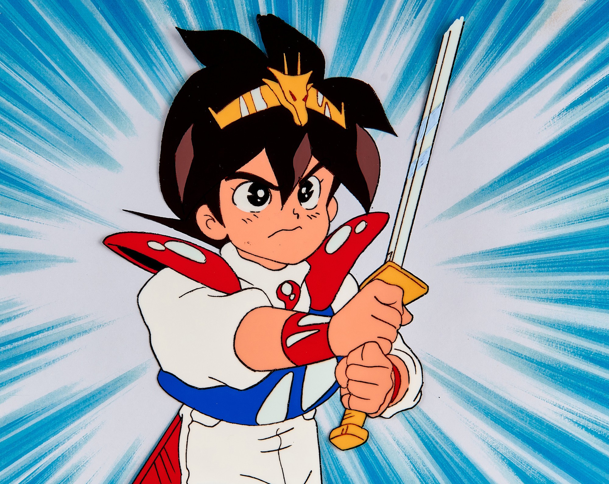 This work by Sunrise Inc. features a vintage cel-animation design from 'Chou Mashin Hero Wataru' including animation cels with accompanying line drawings and printed backgrounds. The piece represents a significant moment in Japanese anime production history.