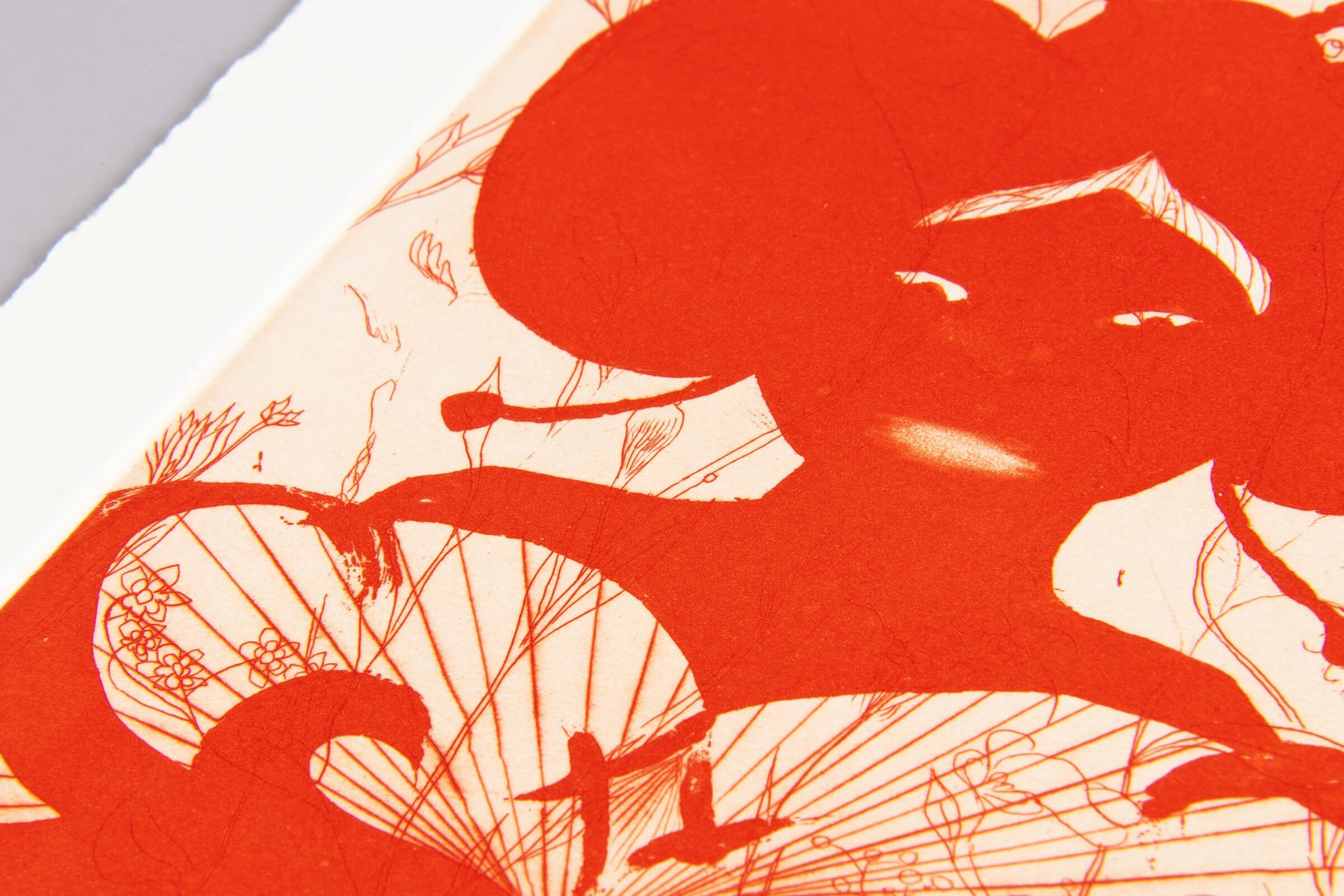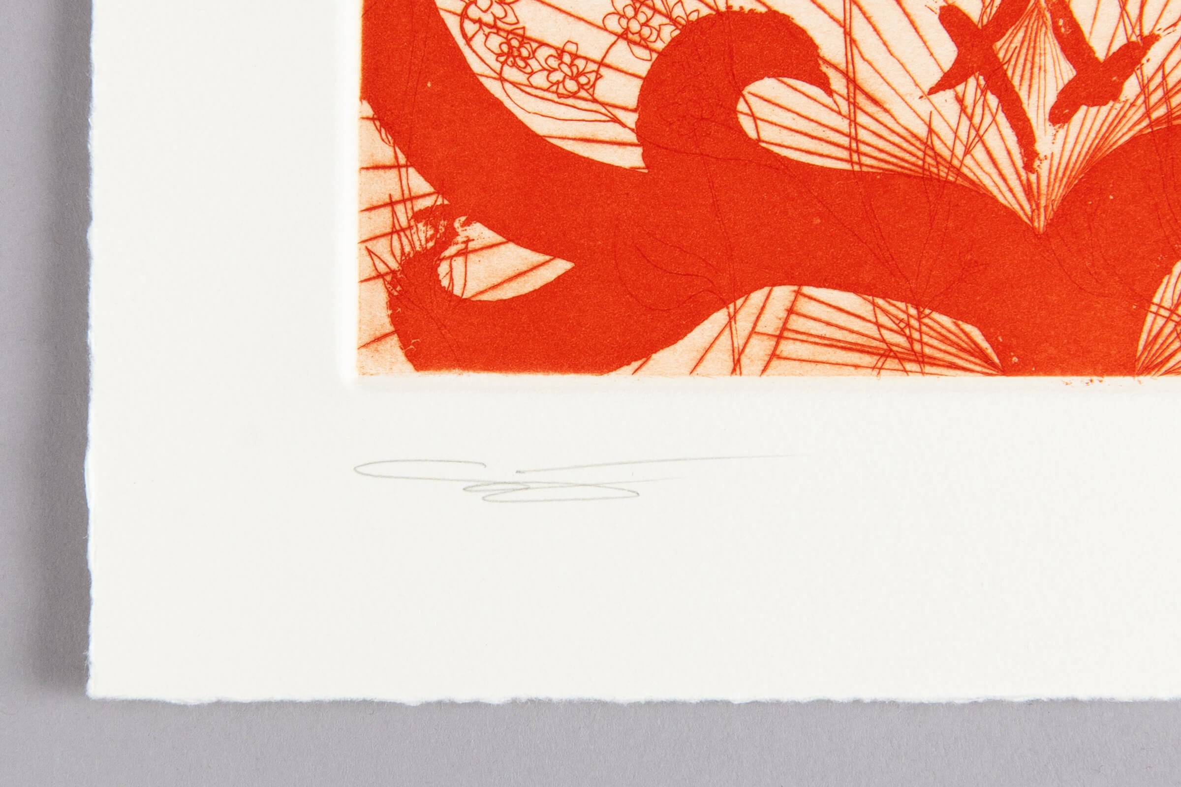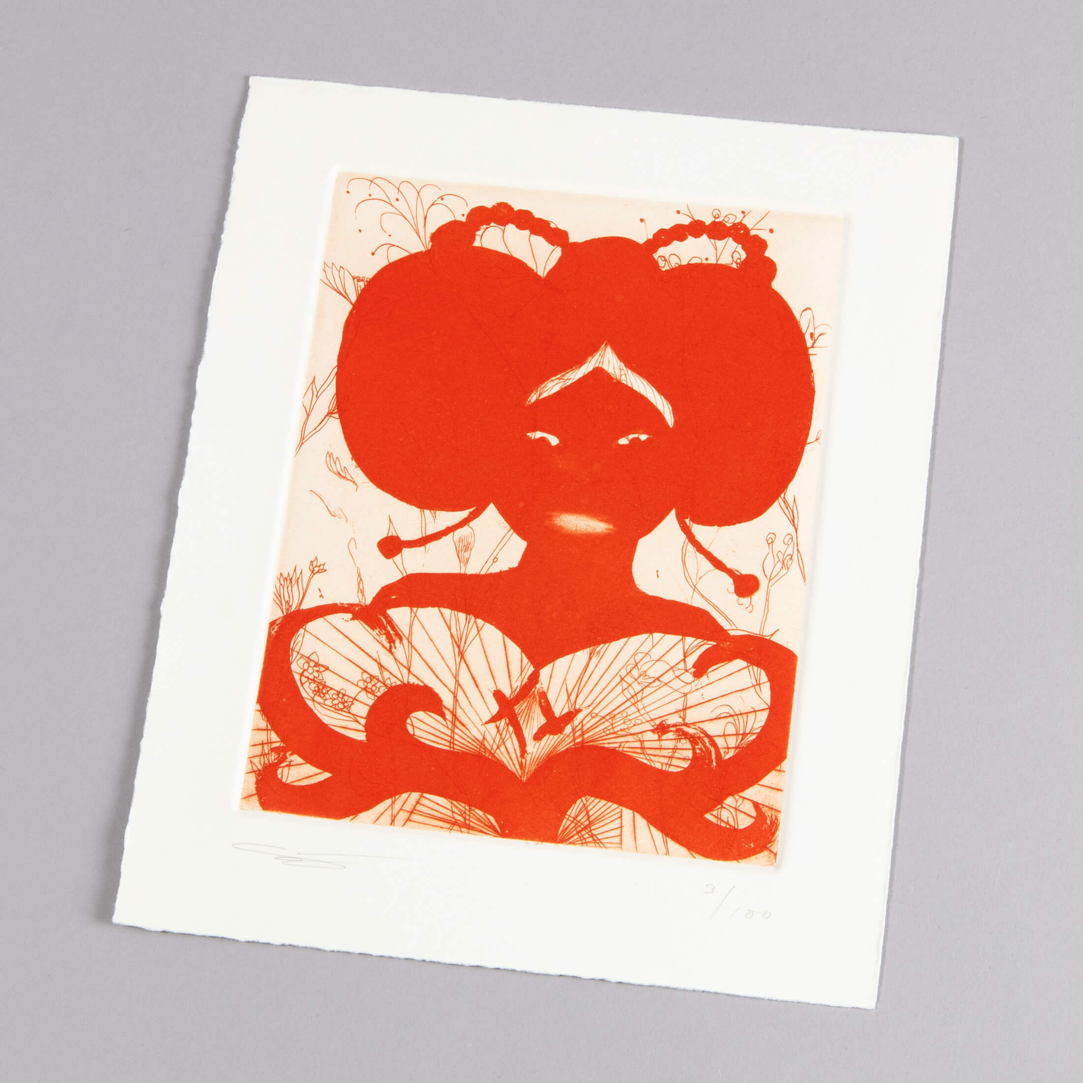 Chris Ofili’s Untitled (Portrait) from 2000 is a signed etching with aquatint and drypoint, printed in a vivid red on Hahnemühle wove paper. Measuring 25.7 × 20.8 cm, the artwork features a stylized female figure with ornate hair and floral motifs, rendered in Ofili’s signature blend of elegance, symbolism, and cultural resonance. Published by Cubitt (London) in a limited edition of 100, each impression is hand-signed and numbered by the artist. This fine art print exemplifies Chris Ofili’s celebrated approach to portraiture, merging contemporary graphic clarity with references to mythology, ornament, and identity.