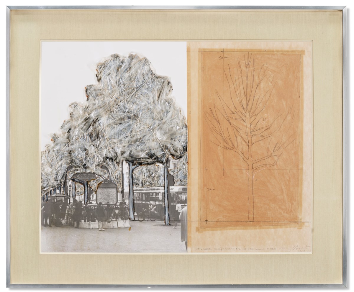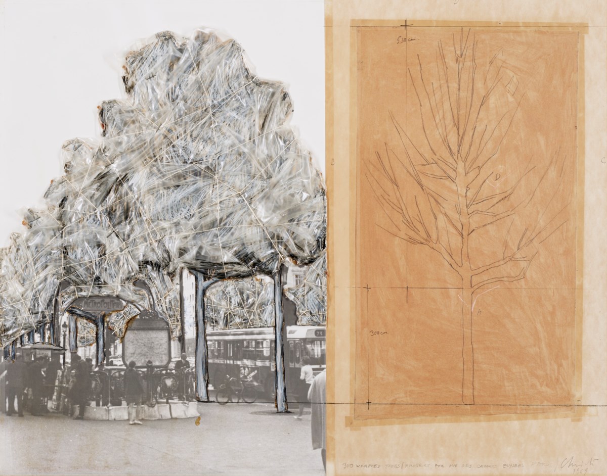 A preparatory study for one of Christo's iconic wrapping projects, this mixed-media work combines photography, drawing, and physical materials to envision the transformation of the Avenue des Champs-Élysées through the swathing of 300 trees in translucent plastic and rope. The layering of black-and-white photography with pastel, felt, and graphite reflects Christo's characteristic process of blending documentary realism with imaginative proposal, collapsing the boundary between plan and artwork. Staples, adhesive tape, and twine embedded in the composition echo the very industrial materials that would bind the trees themselves, making the study an intimate and tactile reflection of the grand public intervention it envisions.