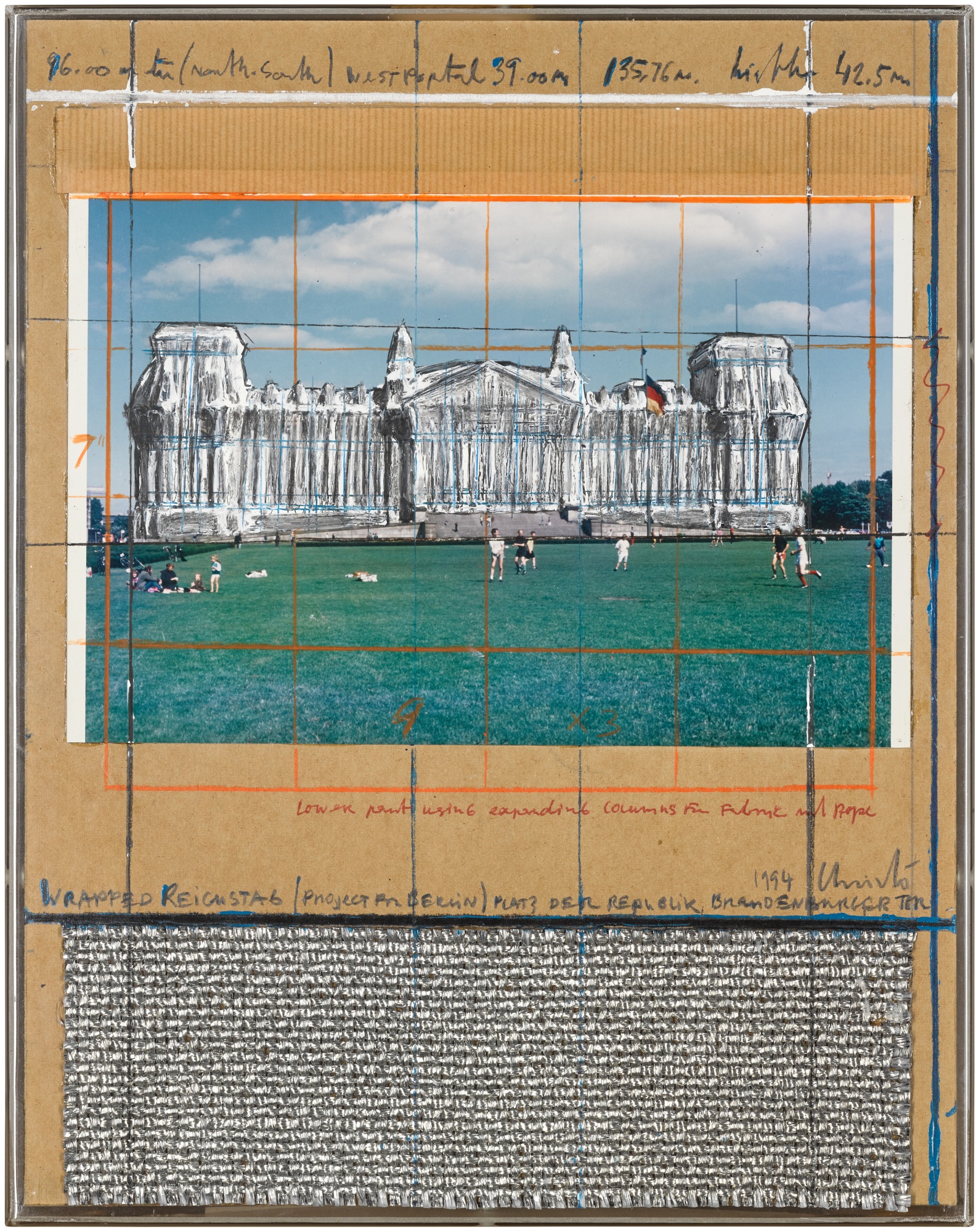 Christo's 'Wrapped Reichstag (Project for Berlin)' is a mixed media collage incorporating pencil, enamel, photograph, crayon, charcoal, ink, and fabric sample on board, displayed in the artist's Plexiglas frame. This work documents the conceptual development of one of the artist's most iconic monumental projects.