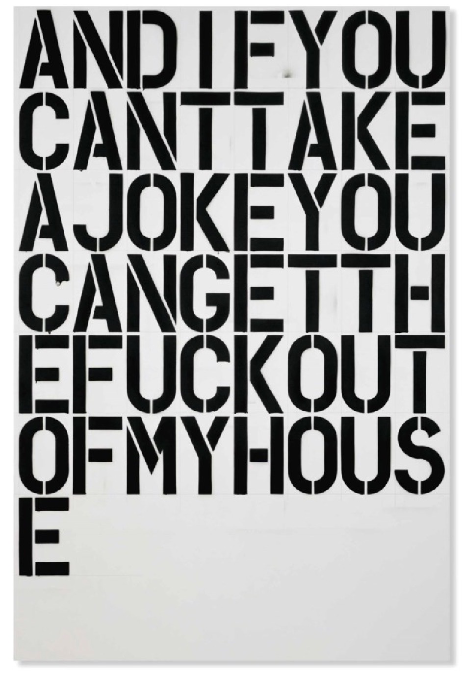 A monumental text-based painting by Christopher Wool, executed in his signature stenciled block-letter format. The work reads 'AND IF YOU CANT TAKE A JOKE YOU CAN GET THE FUCK OUT OF MY HOUSE' in dense black enamel on aluminum, filling the panel with characteristic word-wrap compression. Painted in 1992, this is a prime example of Wool's confrontational language paintings that defined his practice and the trajectory of late 20th-century conceptual art. Signed, titled, and dated 'And If You Wool 1992' on the reverse.