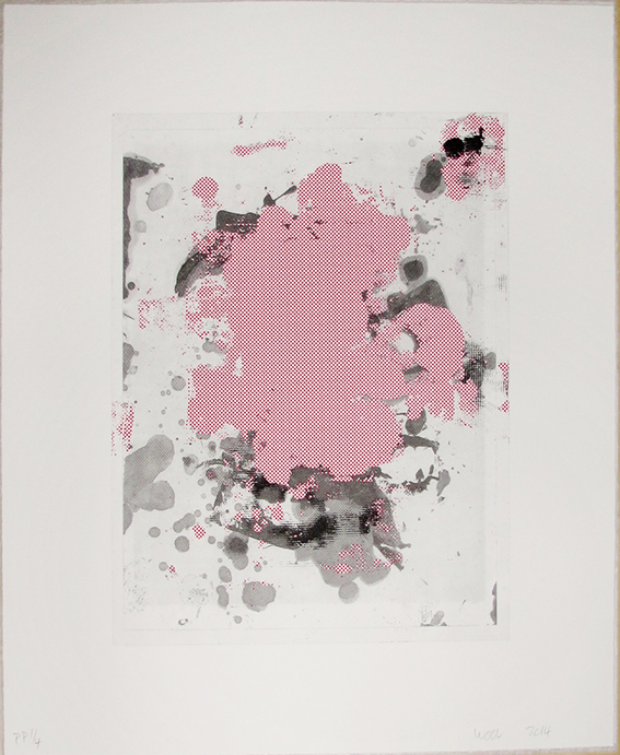 This lithograph exemplifies Wool's characteristic exploration of mechanical reproduction and gestural mark-making, employing his signature technique of layering abstract forms and textural elements. Part of his acclaimed "Portraits" series, the work demonstrates his continued investigation into the relationship between figuration and abstraction through bold red tonalities and deliberate compositional tension.