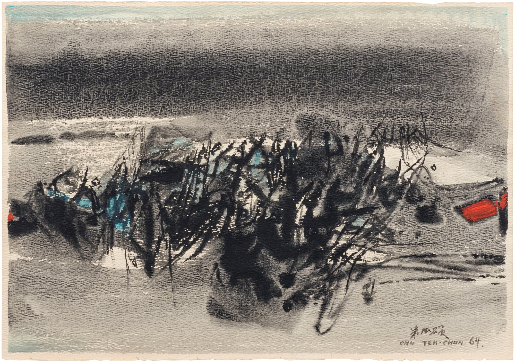 Chu Teh-Chun's 1964 'Composition No. 180' employs ink and gouache on paper in an abstract composition. The work reflects the artist's synthesis of Eastern and Western artistic traditions.