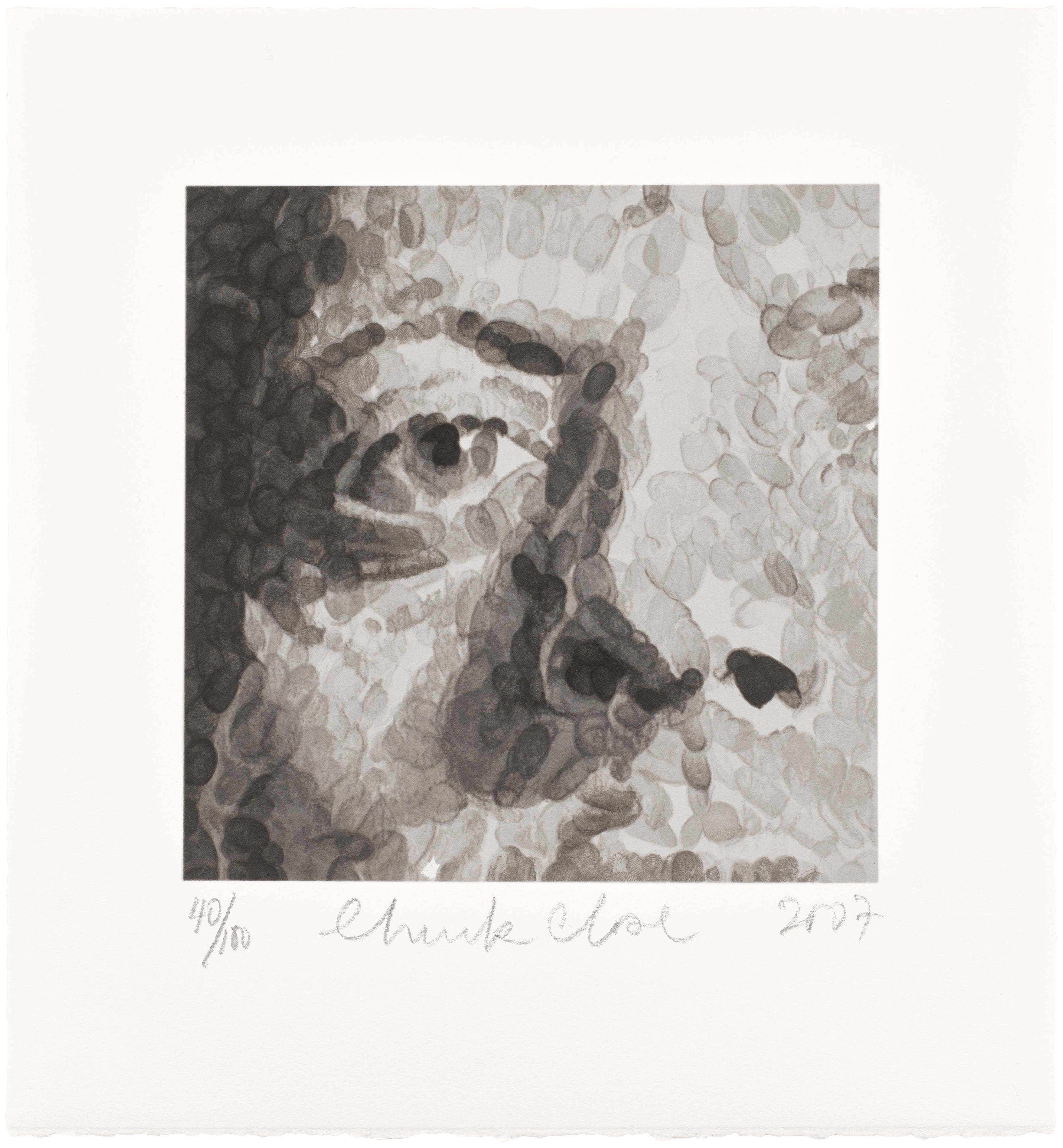 Chuck Close's *Phil (detail)* is a monumental screenprint on Somerset paper that exemplifies his signature grid-based approach to portraiture, breaking down the human face into a mosaic of meticulously arranged abstract marks and cells. The work captures his subject — likely fellow artist Philip Glass — with an intensity that oscillates between photographic precision and painterly abstraction, depending on the viewer's distance. Close's mastery of the screenprint medium is evident in the rich layering of ink that builds depth and tone across the composition's full margins.