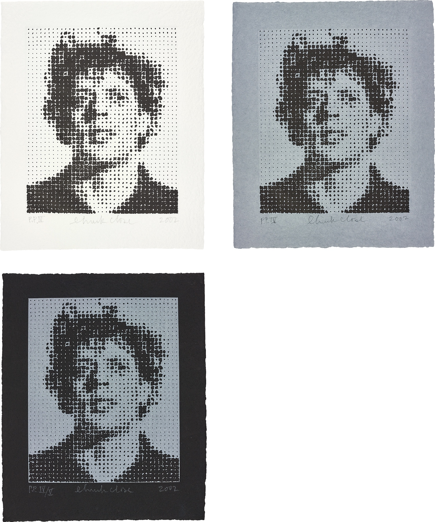 Chuck Close's 'Phil (Philip Glass)' is a major photorealist portrait printed in multiple colours, comprising white, grey, and black sheets as one of five printer's proof sets. The work exemplifies Close's meticulous process and collaboration with master printers.