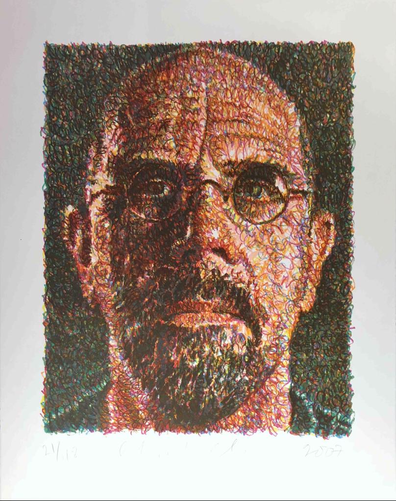 This large-scale screenprint demonstrates Close's mastery of the printmaking medium, translating his signature pixelated portrait technique into bold, geometric color blocks that coalesce into a striking self-portrait. Created during his mature period, the work exemplifies his continued exploration of how systematic mark-making can capture both photographic detail and painterly expression.
