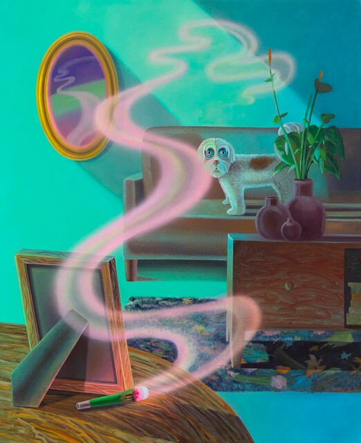 Genie is an oil and acrylic work on canvas created by Cindy Bernhard in 2022. The piece combines two distinct mediums to create a layered and textured composition. The title suggests themes of magic, wish fulfillment, or supernatural power. The work showcases the artist's exploration of color and form through mixed media techniques.