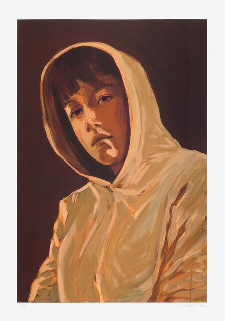 Claire Tabouret's Self Portrait with a Hood (Pink) is a digital print created with UltraChrome pigment inks on museum quality Hahnemühle paper in 2021. The work presents a introspective self portrait rendered in striking pink tones that dominate the composition. Tabouret's use of high quality archival materials ensures the longevity and color fidelity of the print. The hooded figure creates a sense of mystery and psychological depth within the intimate portrait format.