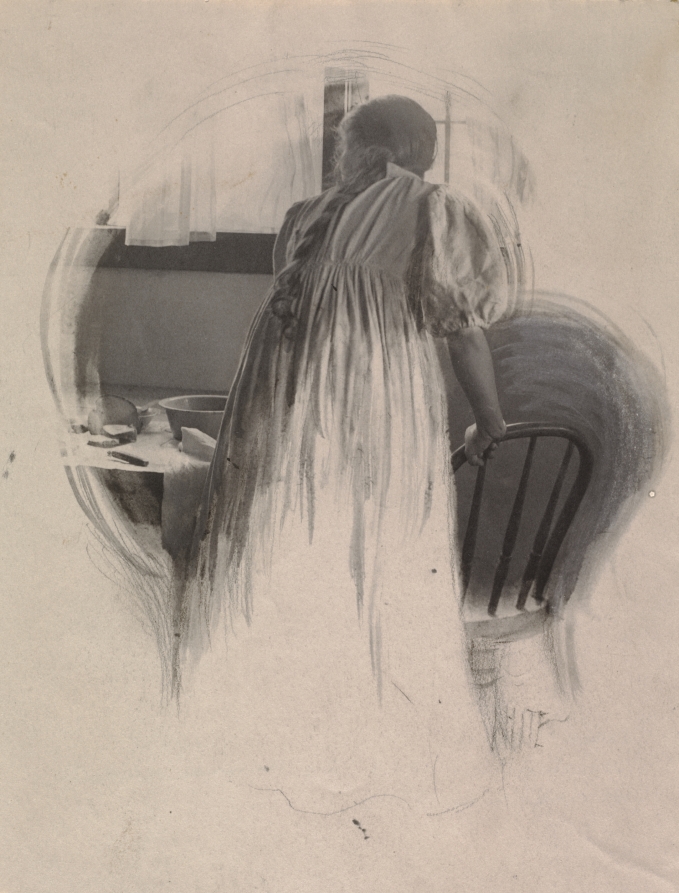 - platinum print with glycerine development, graphite, crayon, and gouache