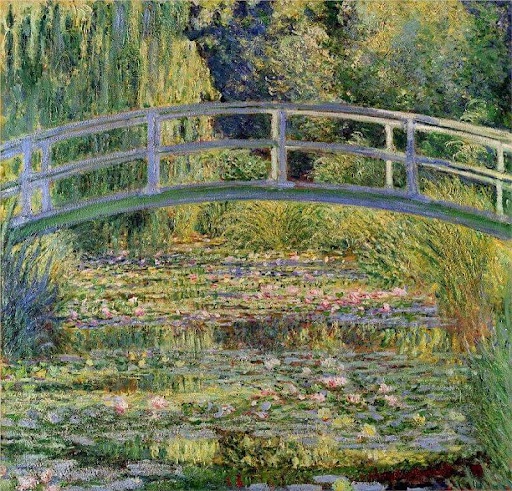 One of Monet's most celebrated series, this luminous painting depicts the iconic Japanese footbridge arching over the water lily pond at his garden in Giverny, France. The composition is a masterwork of Impressionist technique, with dappled greens, soft pinks, and shimmering reflections built up in loose, gestural brushstrokes that dissolve form into sensation. The work exemplifies Monet's lifelong obsession with capturing transient light and its effect on water, foliage, and atmosphere. This version, dated to approximately 1899, belongs to the first major group of the Water Lilies bridge series, now held across leading museum collections worldwide.