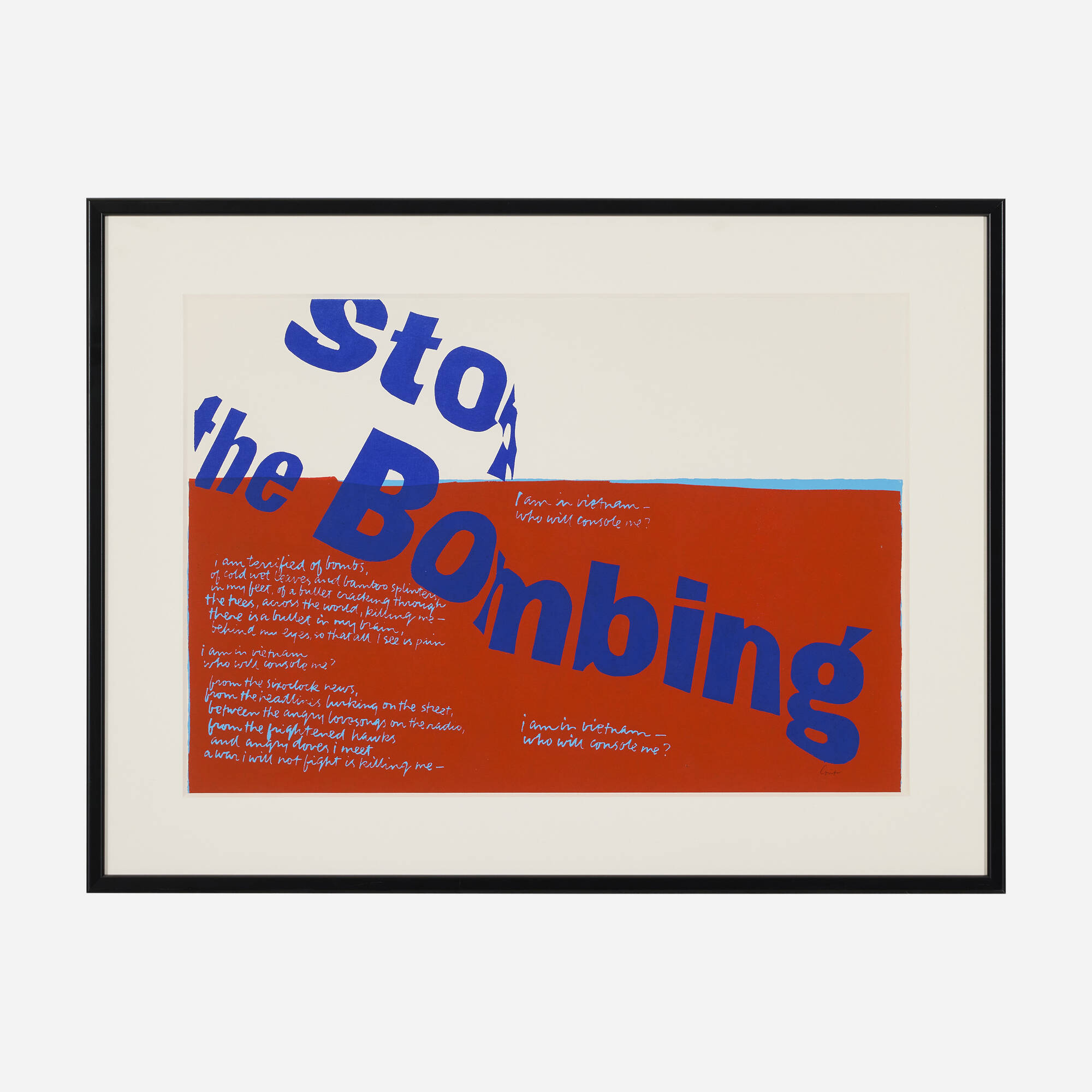 This powerful antiwar screenprint uses bold typography and vibrant color to advocate for peace and social justice. Created in 1967 at the height of the Vietnam War, the work directly addresses political concerns through art. The composition combines urgent messaging with the artist's characteristic colorful abstraction. The design is both visually striking and emotionally compelling. The piece exemplifies how the artist used her art as a vehicle for activism and moral conviction.