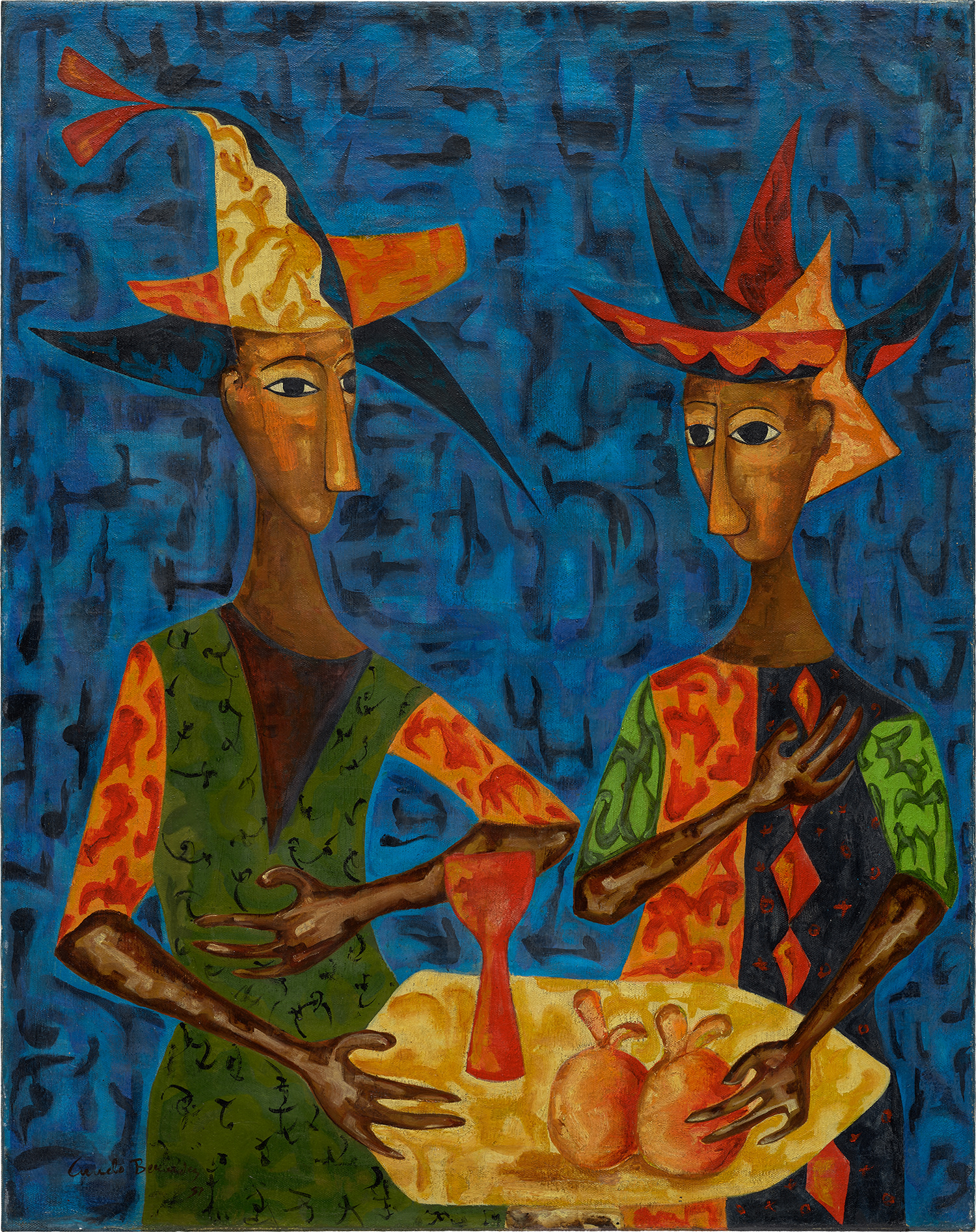 A vibrant and rhythmic composition, Cundo Bermúdez's *Arlequines* (1957) depicts a group of harlequin figures rendered in the bold, flattened forms and vivid color palette that defined the Cuban master's signature style. The painting blends elements of folklore and theatricality with a modernist sensibility, capturing the playful yet enigmatic spirit of the commedia dell'arte tradition. Rich geometric patterning and dynamic contrasts of color animate the canvas, reflecting Bermúdez's celebrated ability to merge Caribbean exuberance with a sophisticated formal language.