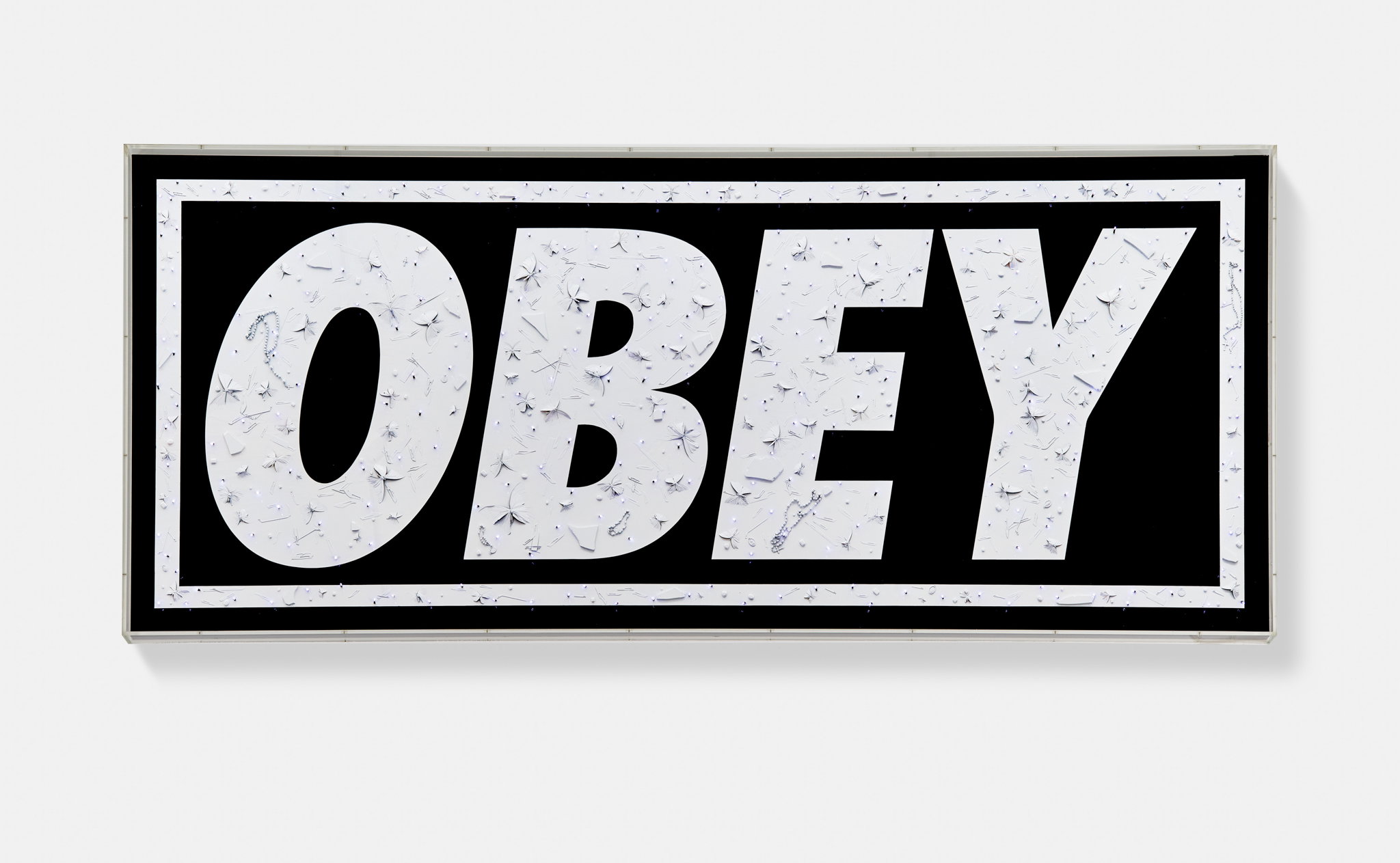 A Sign (for Shepard) is Damien Hirst at his most maximalist and personally communicative, assembling butterflies, cubic zirconia, scalpel blades, mirror, religious artefacts, fairy lights, and household gloss on canvas into a work that functions simultaneously as tribute, provocation, and memento mori. The dedication to Fairey embedded in the title transforms the piece into a rare act of artistic intimacy from Hirst, whose practice more typically maintains a cool conceptual distance, and the inclusion of fairy lights — a vernacular, domestic material — suggests a warmth unusual in his output. Scalpel blades and religious artefacts create a charged tension between clinical violence and sacred meaning, a duality Hirst has explored throughout his career in works dealing with mortality and transcendence. The butterflies, his most enduring motif, are here embedded among glittering cubic zirconia and mirrored surfaces, creating an almost hallucinatory spectacle that mirrors Fairey's own use of radiant, attention-commanding imagery. Together the materials read as a coded language between two artists — a sign, as the title states, that meaning can be constructed from the collision of the sacred, the commercial, the beautiful, and the deadly.