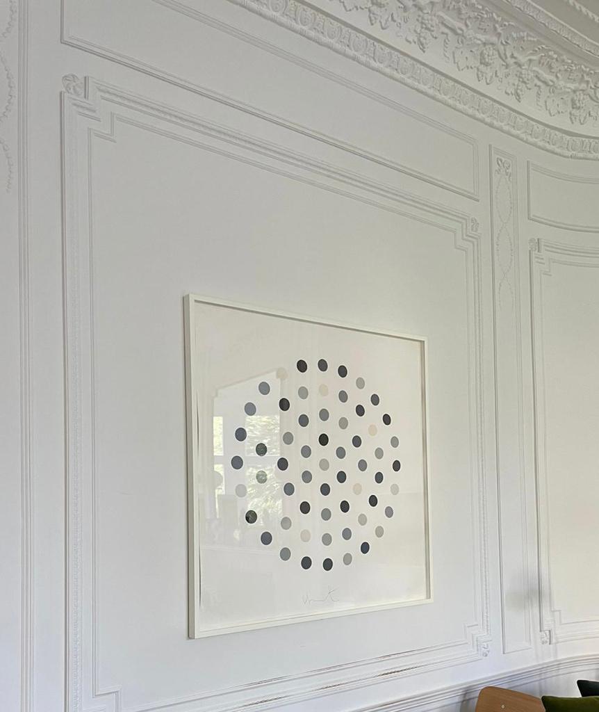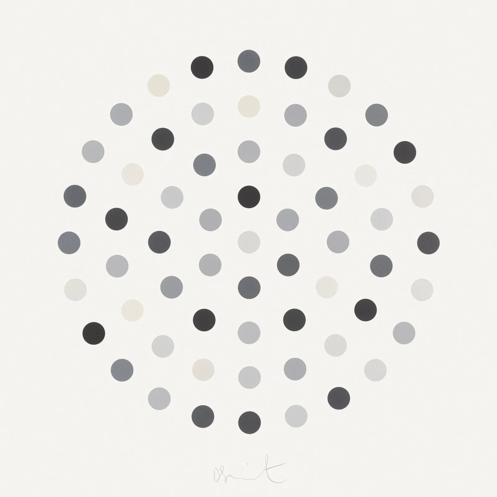 Cinchonidine (2004) is a monochromatic etching from Damien Hirst's celebrated Spot series, presenting a circular arrangement of uniformly sized dots rendered in a refined palette of blacks, greys, and off-whites. Named after the pharmaceutical compound cinchonidine, the work exemplifies Hirst's systematic exploration of repetition, order, and scientific nomenclature. Hand-signed and numbered by the artist, this edition of 145 on Hahnemühle paper represents one of the more collectible print works from his Spot corpus. The restrained monochrome palette distinguishes it from the more widely known multicolour Spot paintings, lending it a particular elegance suited to discerning collectors.