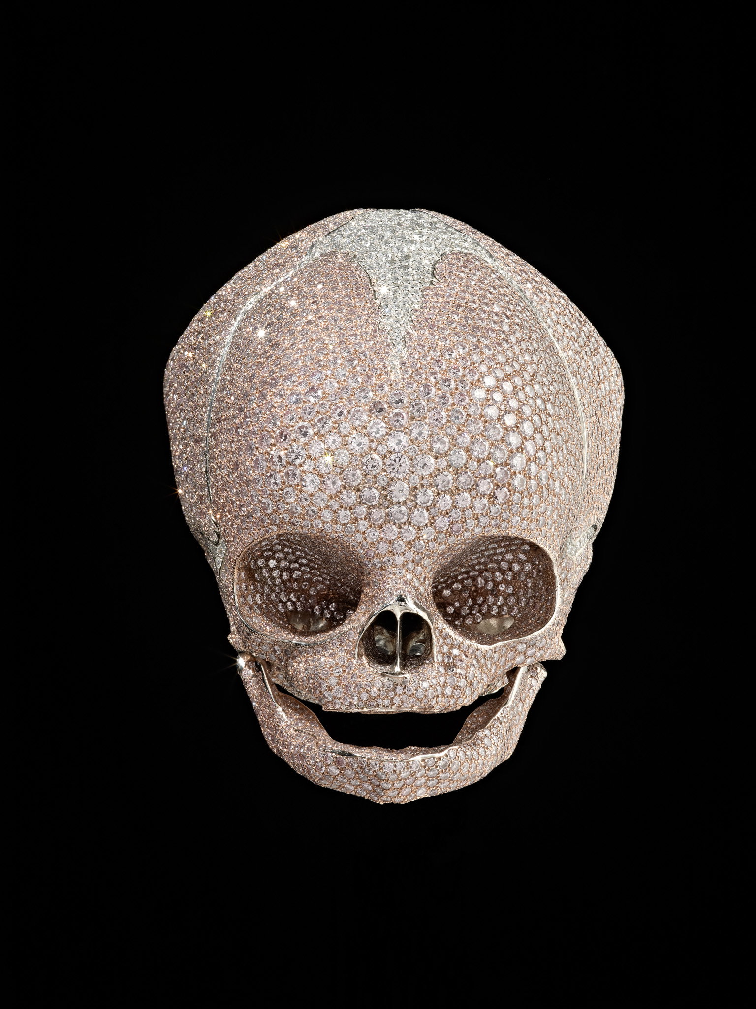 For Heaven's Sake stands as one of Damien Hirst's most audacious and opulent sculptures, a platinum cast of a child's skull encrusted with pink and white diamonds that transforms innocence and mortality into a dazzling, almost unbearable confrontation. Created in 2008 as a companion piece to his infamous For the Love of God, Hirst employs the same radical juxtaposition of luxury materials against symbols of death, using precious stones not to celebrate life but to interrogate our desire to beautify and deny it. The choice of a child's skull amplifies the existential weight, suggesting that mortality claims even the most innocent, while the diamonds — culturally coded as eternal and pure — create a devastating irony. Within the Triple Trouble collaboration, this work anchors the collection's conceptual ambitions, setting a provocative benchmark for how art can weaponize beauty to disturb. The title itself, a colloquial expression of astonishment, becomes deeply loaded: is it heaven's sake we decorate death for, or our own?