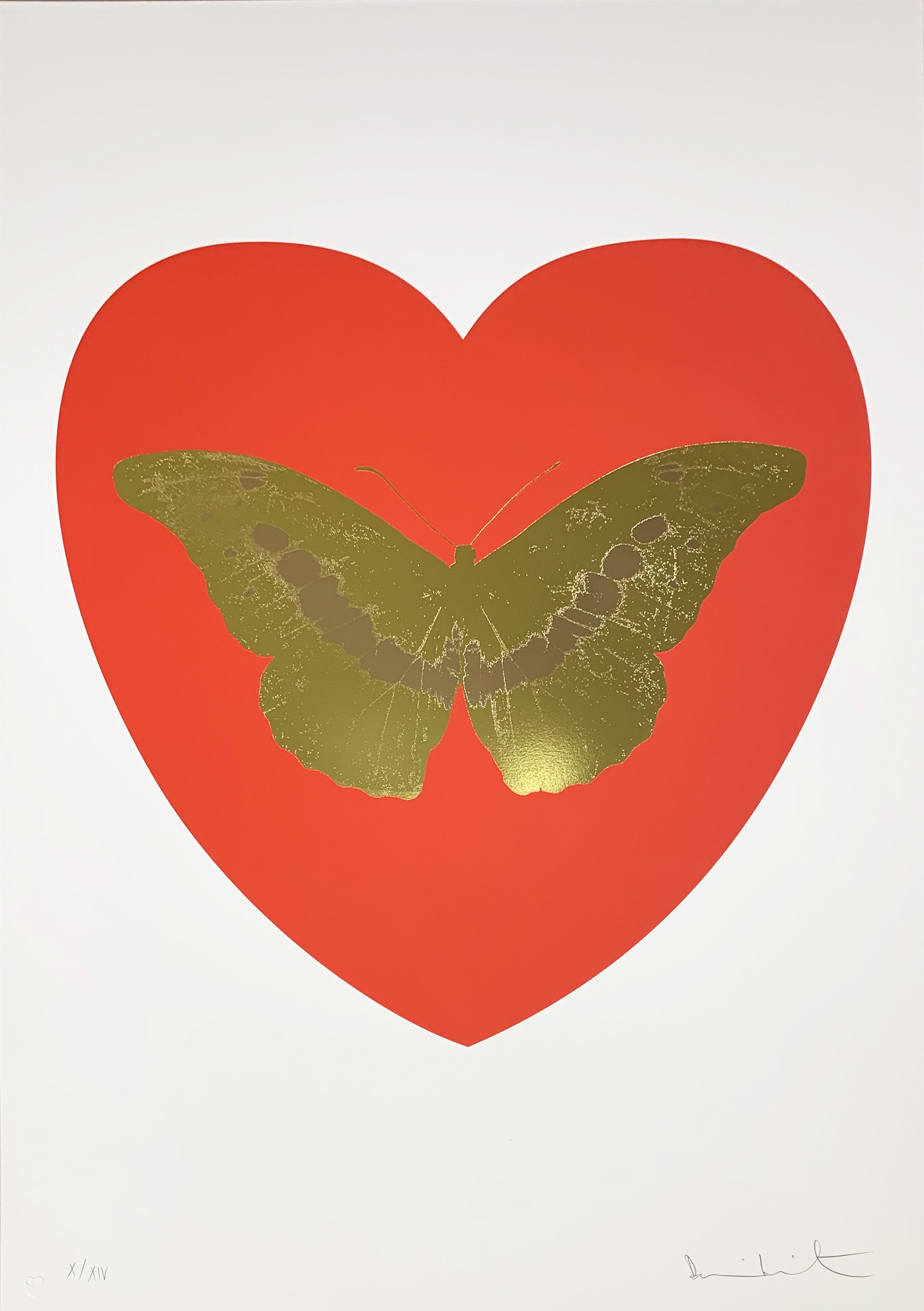 This limited edition print exemplifies Hirst's exploration of love and mortality through his signature spot painting motif, rendered in luxurious red and gold foil blocking techniques. The work combines the artist's conceptual preoccupations with precious materials and meticulous printmaking processes, creating a tactile meditation on desire and value.
