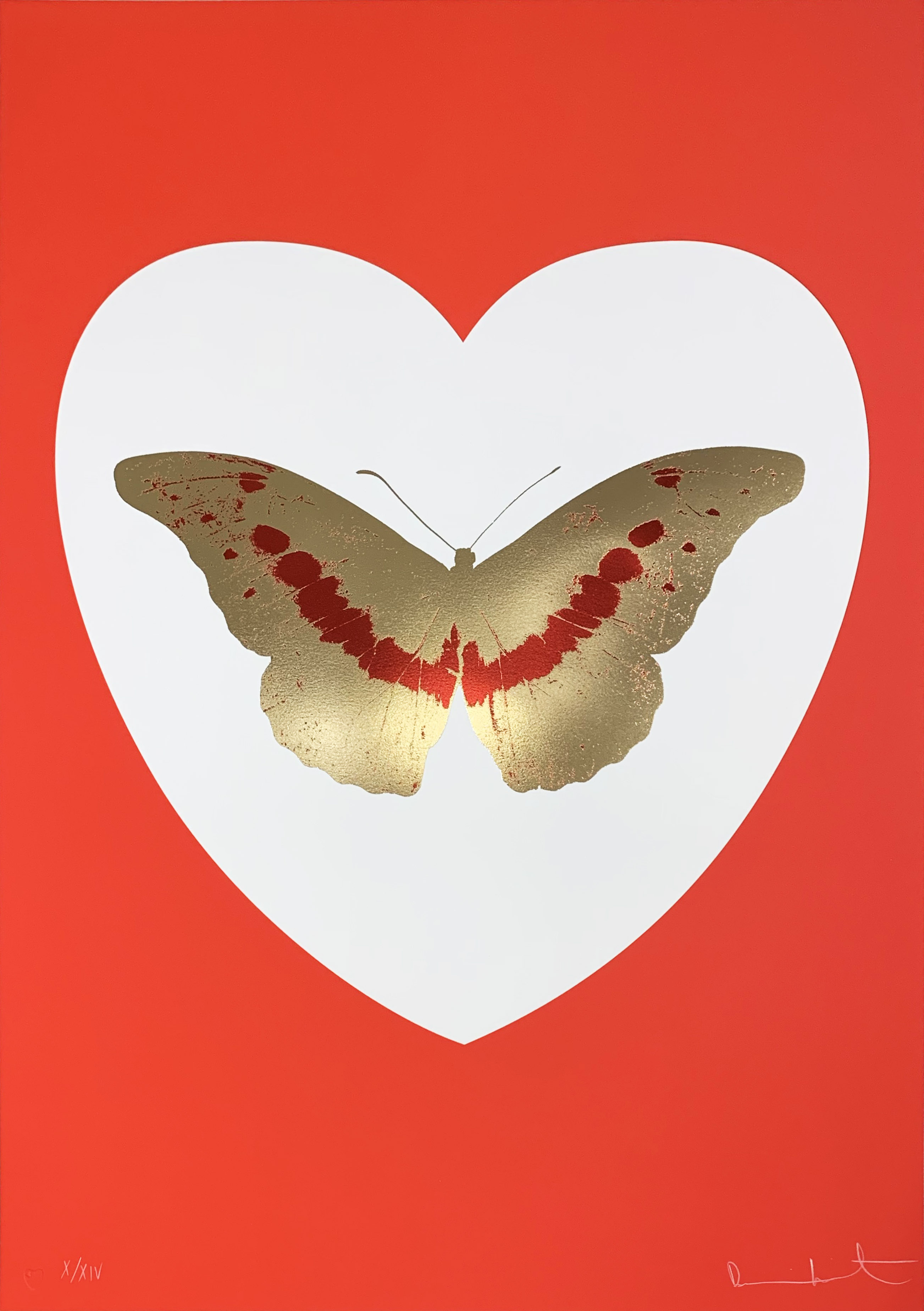 This limited edition print exemplifies Hirst's exploration of love and mortality through his signature spot painting aesthetic, rendered in a refined palette of white, red, and metallic tones. The combination of silkscreen and foil block printing techniques creates luminous surface effects that elevate the work beyond his typical pharmaceutical imagery into more emotionally resonant territory.