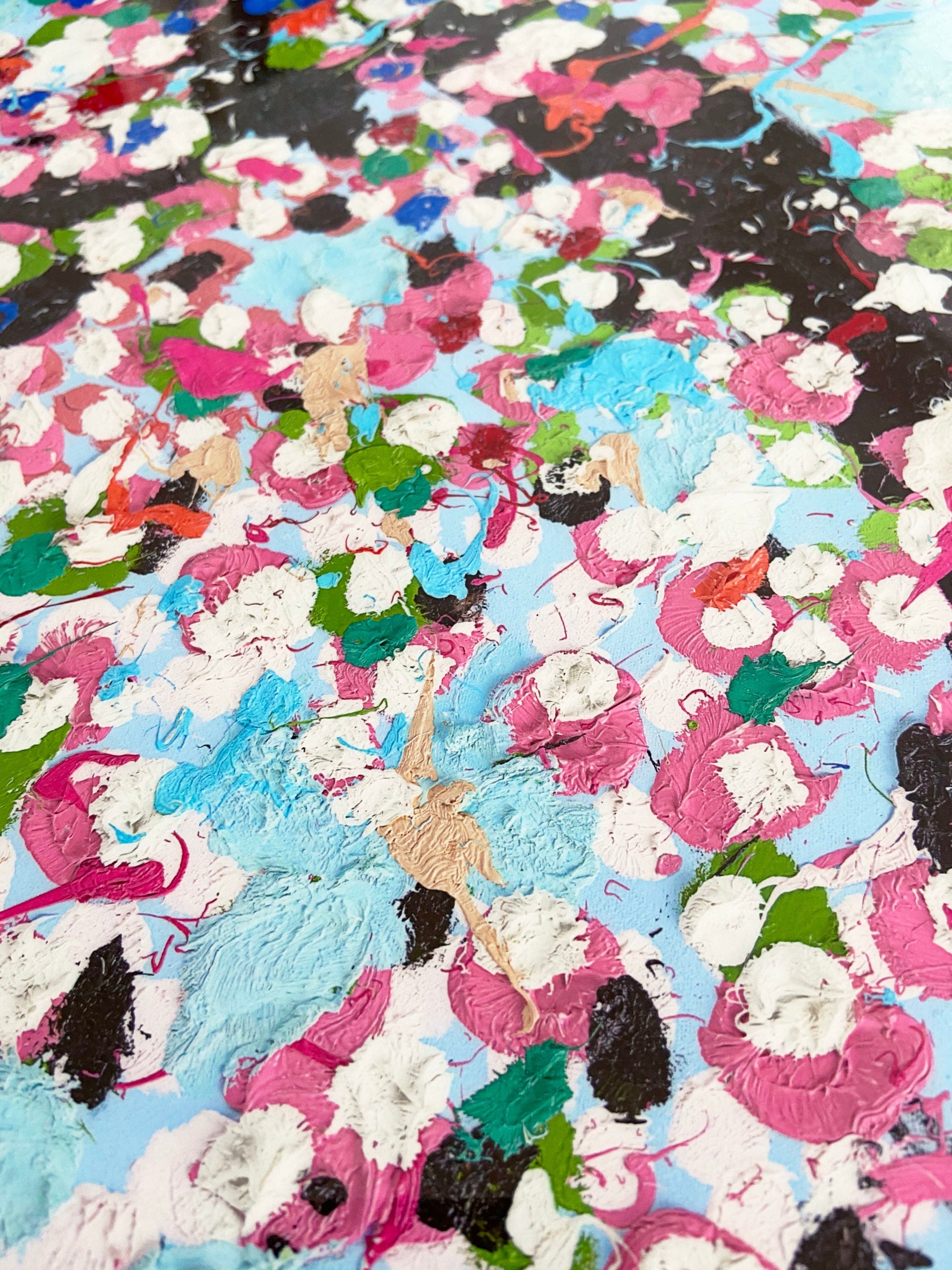 Damien Hirst 's Loyalty H9-7 (2021) belongs to The Virtues, a major print series inspired by the Eight Virtues of Bushidō , the ethical code of the Japanese samurai. The artwork depicts flowering cherry branches set against a vivid blue sky, rendered in Hirst's distinctive pointillist language that balances exuberant color with rhythmic structure. Printed as a signed limited edition laminated giclée print on an aluminum composite panel, the composition evokes both transience and resilience, aligning natural renewal with the virtue of unwavering devotion. Issued in an edition of 1,067, each hand-signed and numbered fine art print translates Hirst's meditation on loyalty into a visually radiant contemporary artwork.