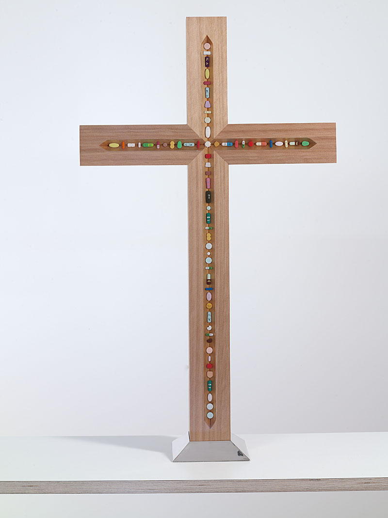 This sculptural work exemplifies Hirst's ongoing fascination with mortality and pharmaceutical culture, embedding hand-colored pewter pills within cedar wood to create a contemporary meditation on faith, death, and healing. The piece bridges his signature pill installations with religious iconography, transforming the traditional crucifix into a complex symbol of modern salvation through medicine.