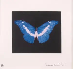 "To Belong" from Damien Hirst's Butterfly Etchings series is a colored etching with aquatint created in 2008 as part of a limited edition of 75 prints published by Other Criteria in London. The work exemplifies Hirst's characteristic use of natural imagery and meticulous printmaking technique, combining the delicate aesthetic of butterfly forms with the classical medium of etching. Presented in full margins and professionally framed at 48 x 51 centimeters, this signed and numbered impression demonstrates the artist's sustained engagement with themes of transformation and natural beauty that define much of his practice.