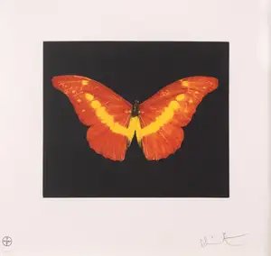 "To Love, from Butterfly Etchings" is a colored etching with aquatint created by Damien Hirst in 2008, published by Other Criteria in London as part of a limited edition of 75 prints. The work exemplifies Hirst's fascination with natural forms and mortality, themes he explores through his recurring use of butterflies as both decorative and symbolic elements. Printed on wove paper with full margins and signed by the artist, this piece represents Hirst's engagement with traditional printmaking techniques to explore contemporary concepts of beauty and transience.