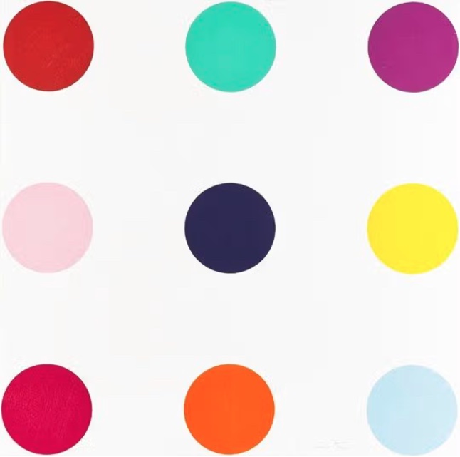 A vibrant woodcut by Damien Hirst from his celebrated Spot series, 'Tryptophan' (2010) features nine evenly spaced polka dots in a range of bold and pastel hues — including red, teal, purple, pink, navy, yellow, crimson, orange, and light blue — arranged in a 3×3 grid on a white ground. Named after the amino acid tryptophan, the work exemplifies Hirst's systematic yet visually arresting approach to colour and pattern. Part of a signed edition of 48, this large-format woodcut (102 × 102 cm) is a sought-after example of one of the most iconic bodies of work in contemporary British art. Listed at £25,000, it represents a rare opportunity to acquire a signed, editioned Hirst print of this scale.