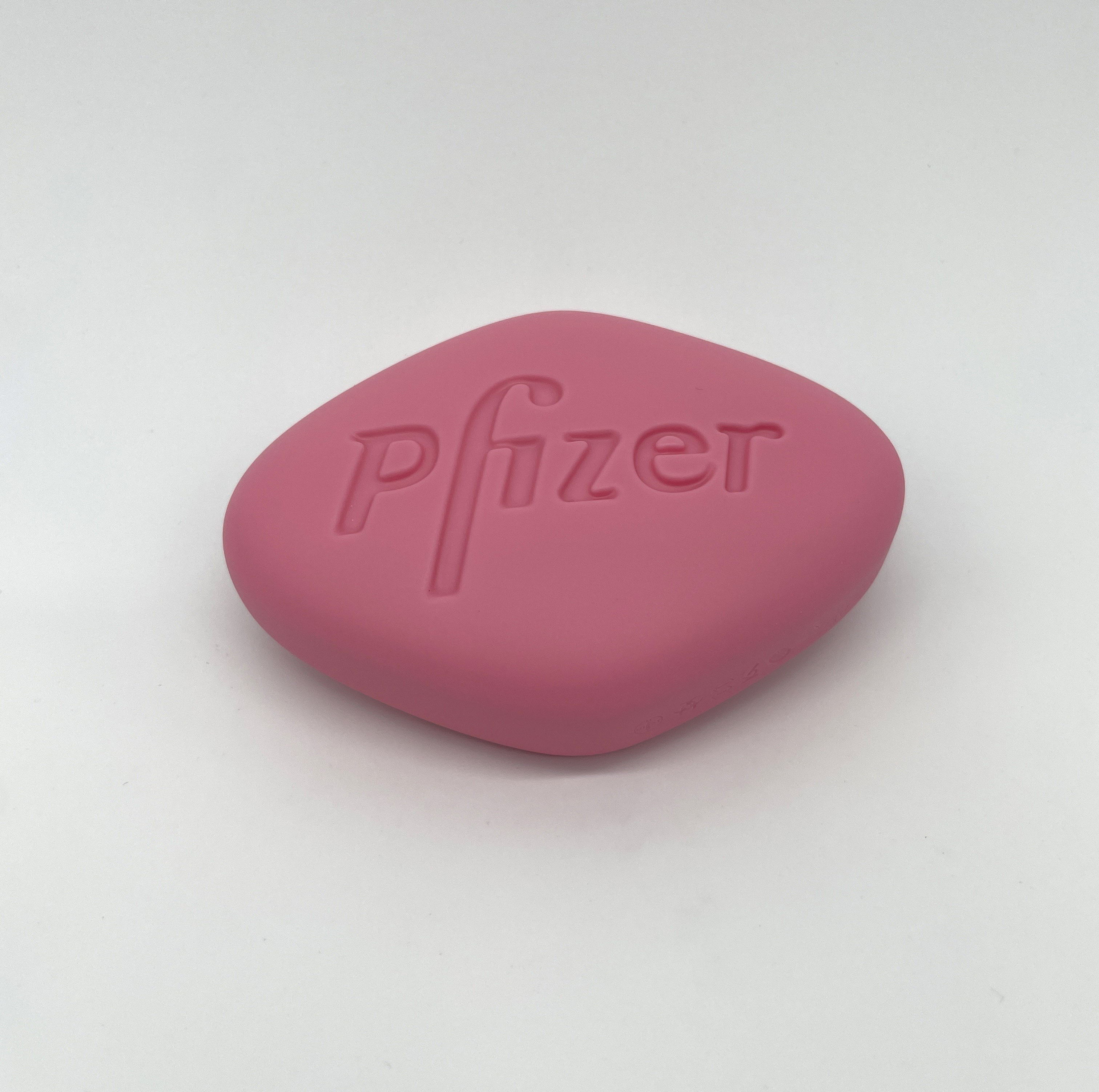 This polyurethane resin multiple exemplifies Hirst's ongoing fascination with pharmaceutical culture and mortality, presenting a precisely rendered Viagra tablet in vivid pink that transforms an intimate medical object into a collectible art commodity. The work continues the artist's exploration of mass production and desire while employing his signature technique of elevating mundane objects through meticulous material transformation.