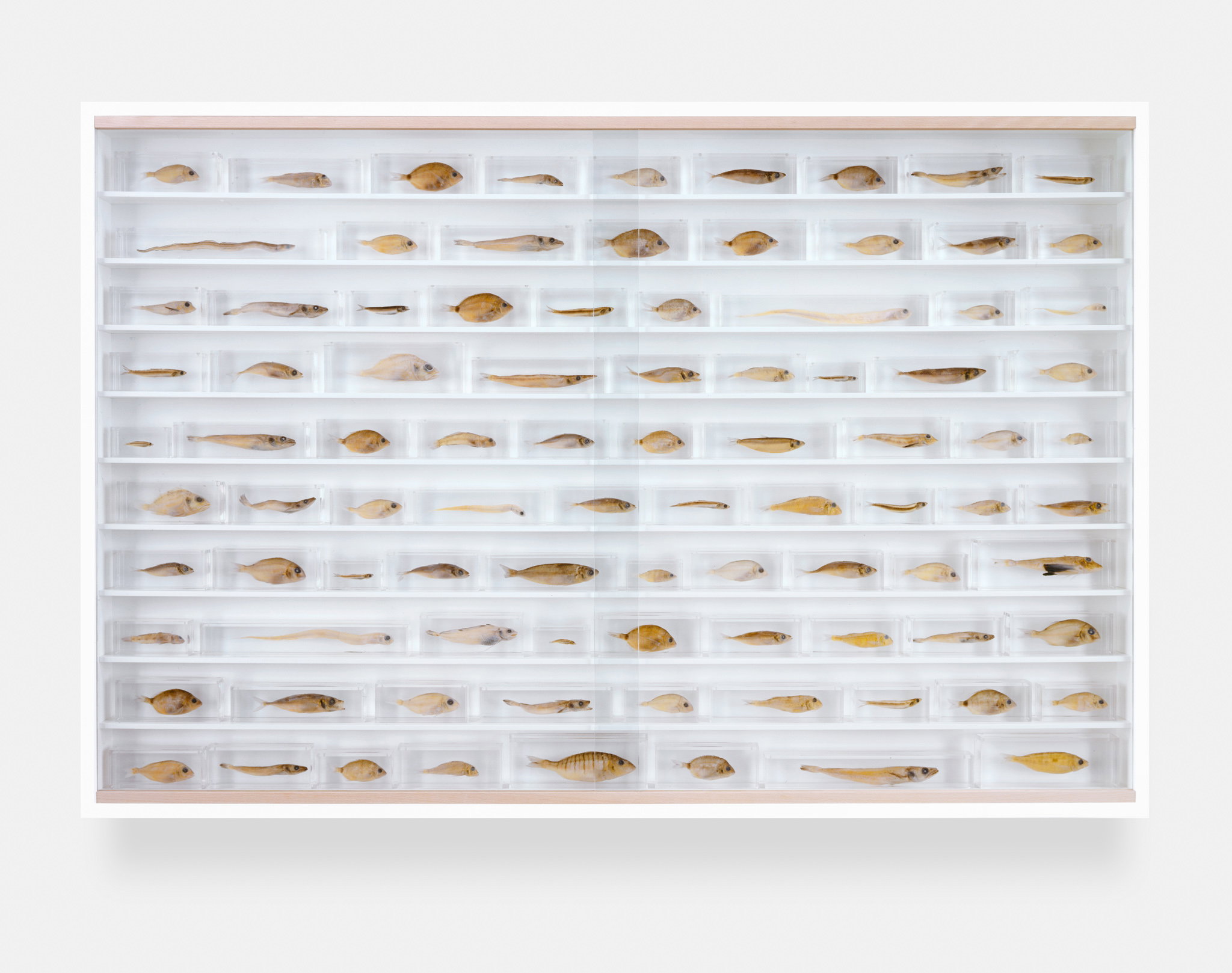 - Glass, painted MDF, beech, acrylic, fish and formaldehyde solution