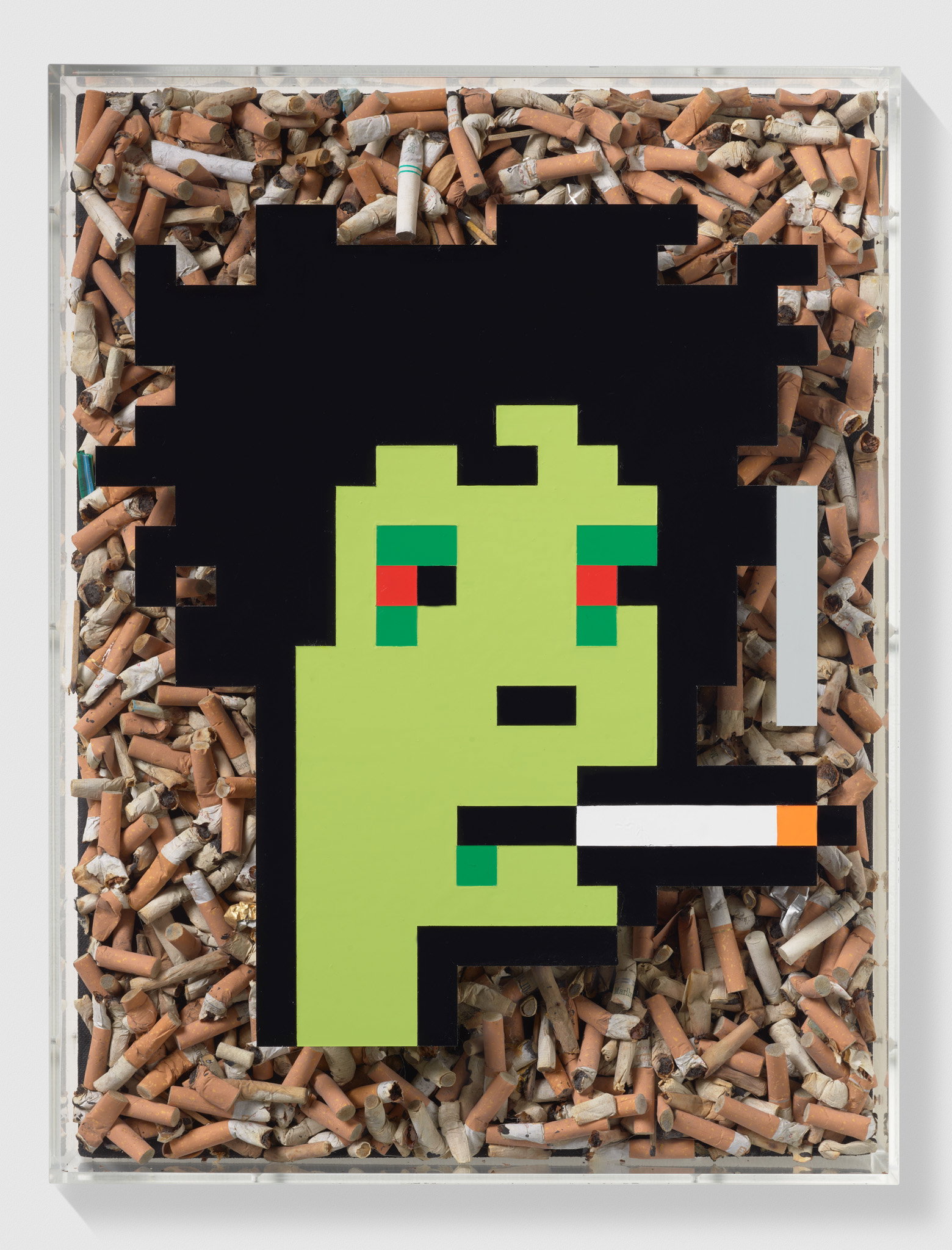 Zombie Joe is perhaps the most audaciously transgressive work in the Triple Trouble collection, using the literal detritus of human habit — the actual contents of an ashtray — as its primary material, combined with acrylic and paint on canvas. Hirst has long incorporated organic, decaying, or abject materials into his work to confront viewers with the unavoidable presence of mortality, and ash carries an almost archetypal symbolic weight, evoking cremation, ruin, and the aftermath of consumption. Invader's contribution shifts the register unexpectedly, with the pixelated aesthetic associated with his practice lending the figure of Zombie Joe a cartoonish, 8-bit quality that softens and simultaneously deepens the work's morbid content. The name Zombie Joe is casually human and yet deeply uncanny, suggesting a specific individual reduced to a kind of undead anonymity — a figure who persists beyond their own dissolution. The collision of cigarette ash, the most banal and throwaway of materials, with the gravity of fine art canvas speaks to both artists' shared interest in elevating the overlooked and forcing a confrontation with what we prefer to discard.