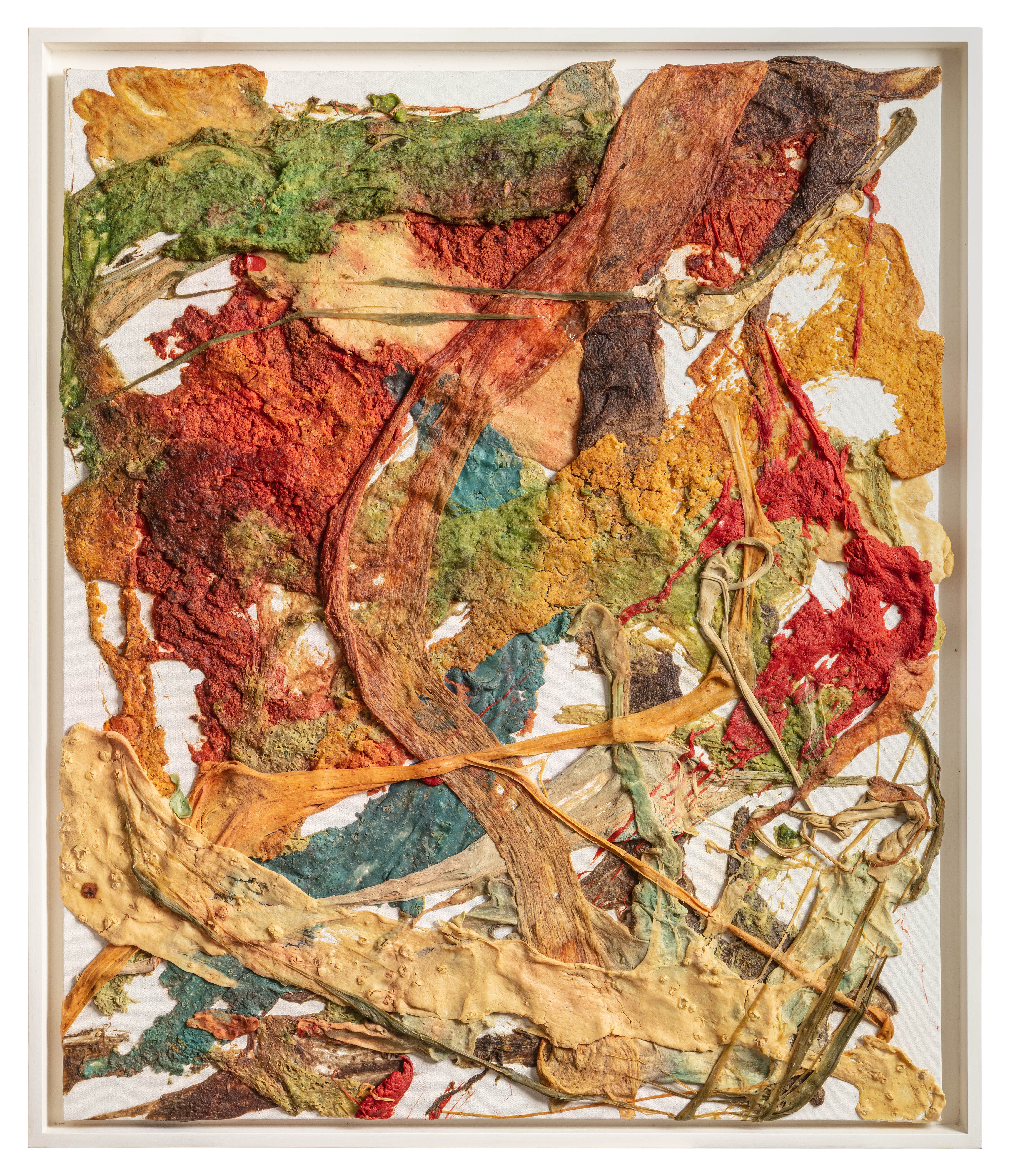 Dan Colen's 'Last in Line' (2010) is an unconventional artwork created using chewing gum applied directly to canvas. This work challenges traditional notions of artistic materials by employing an everyday, disposable substance as a medium for fine art expression.
