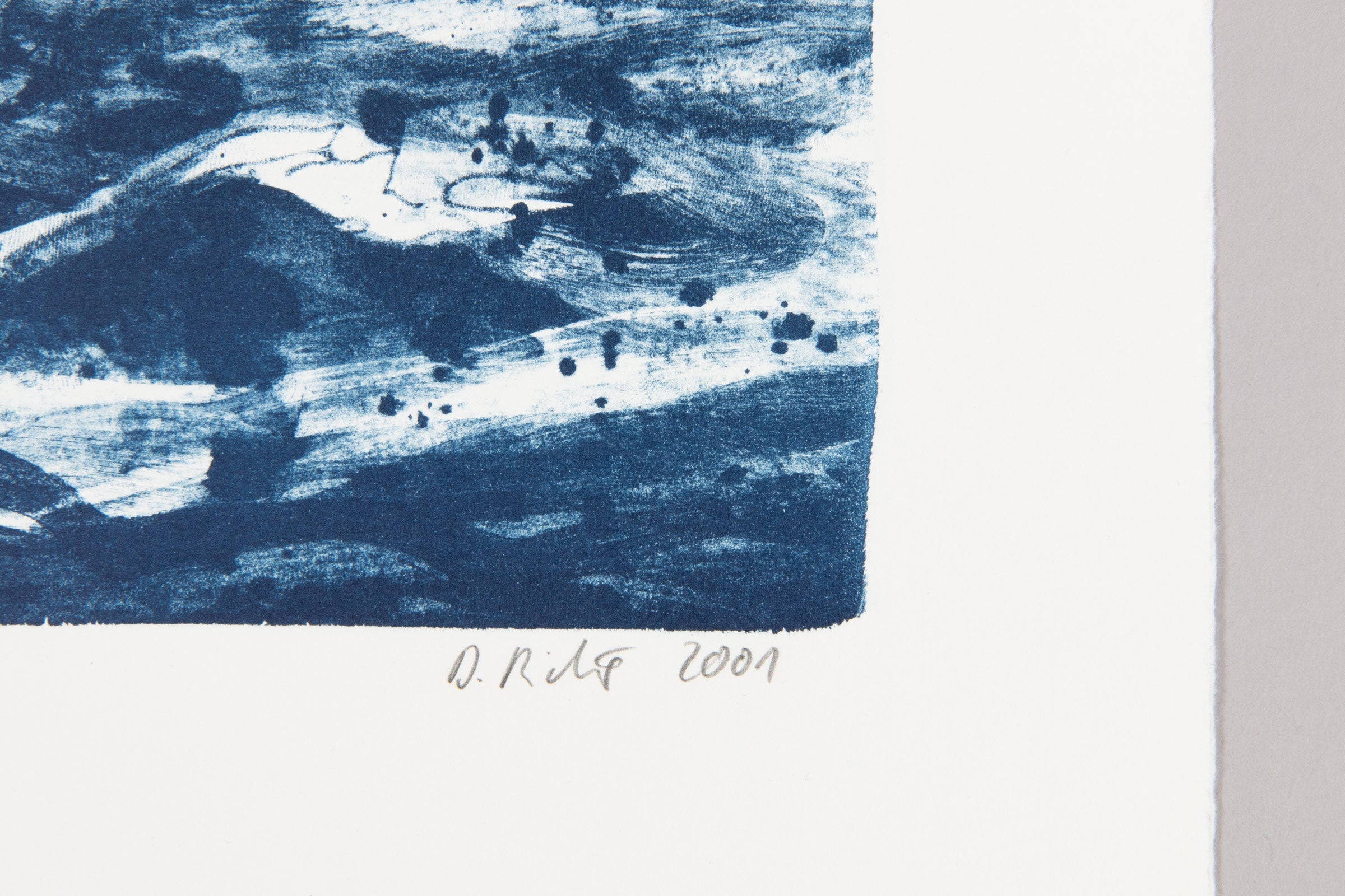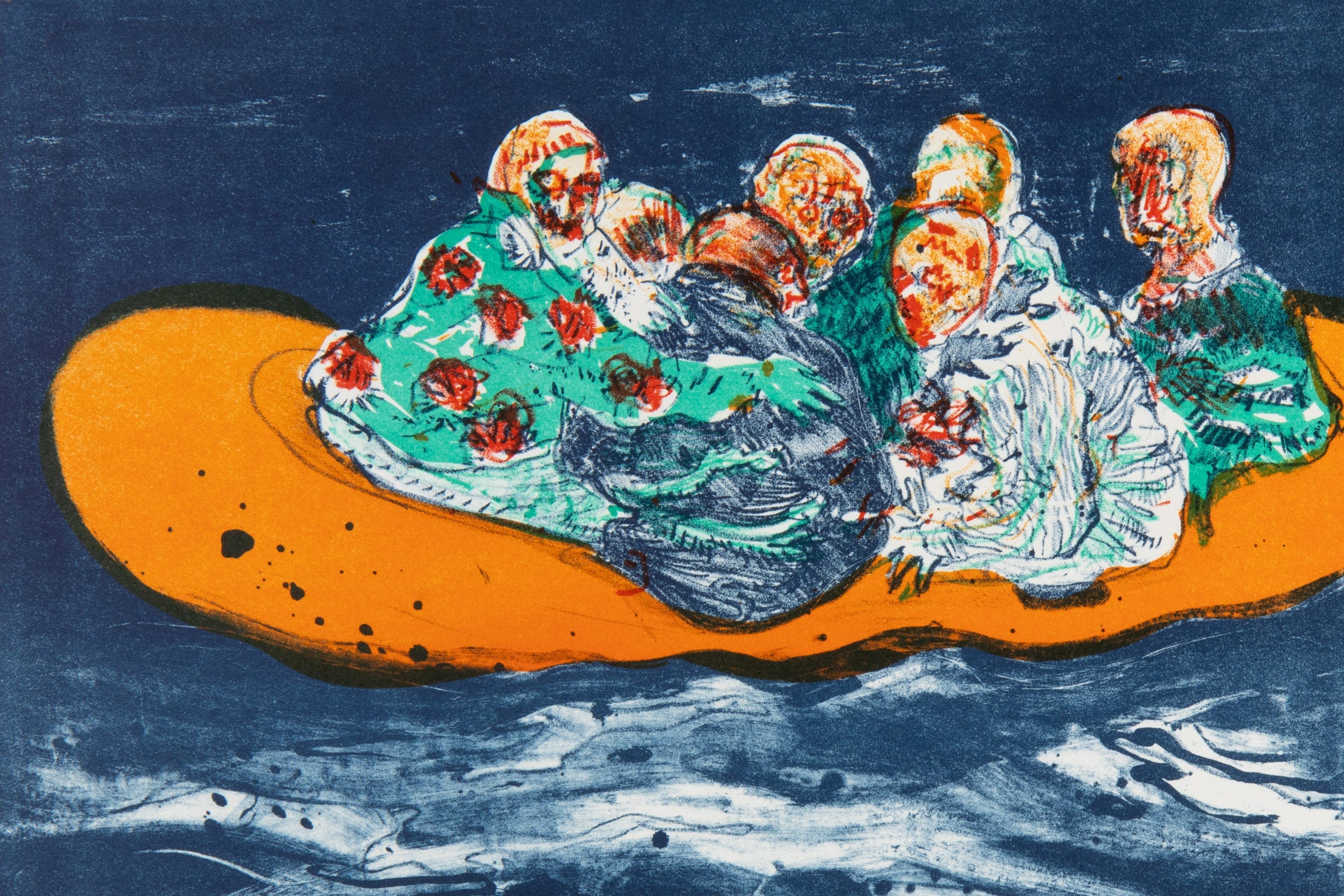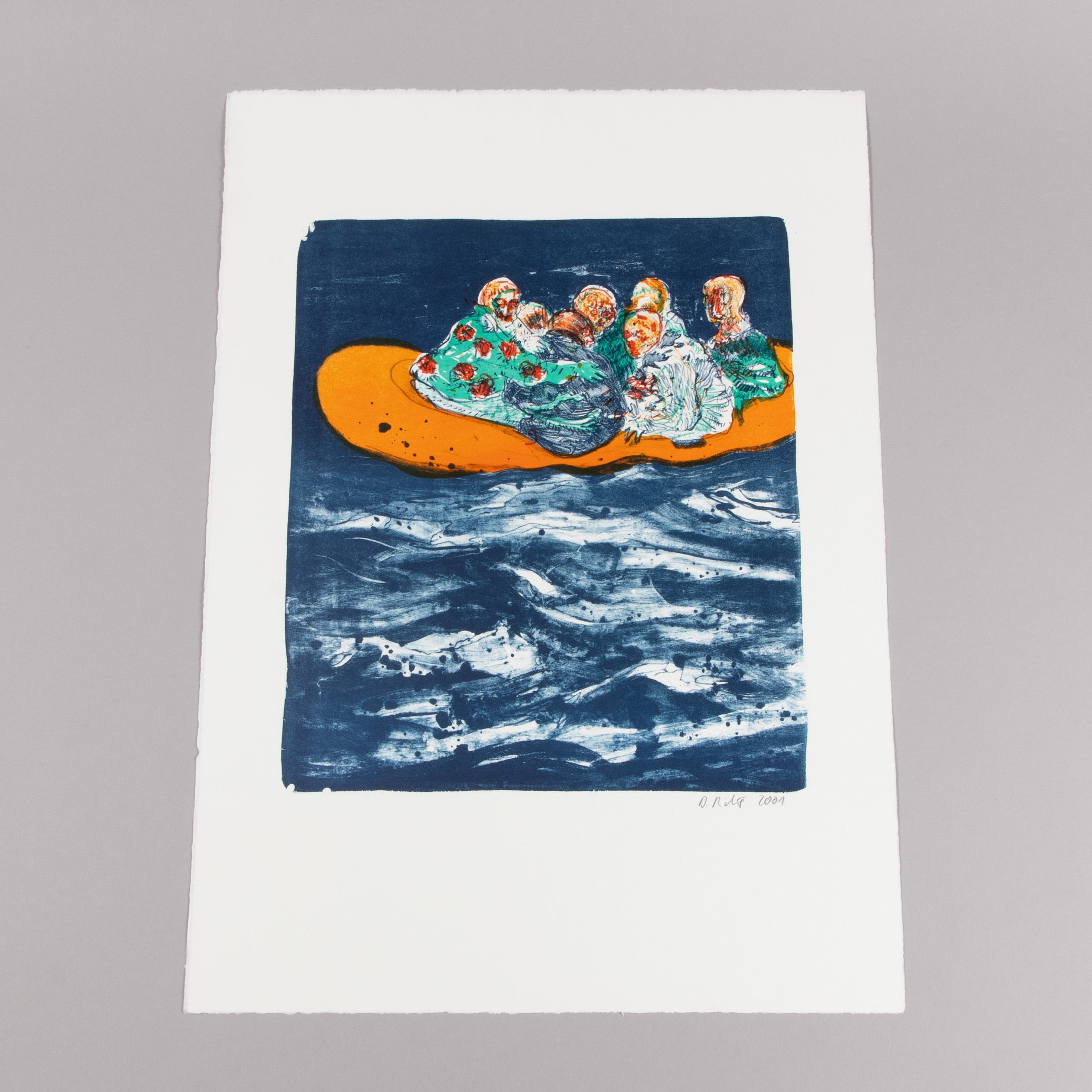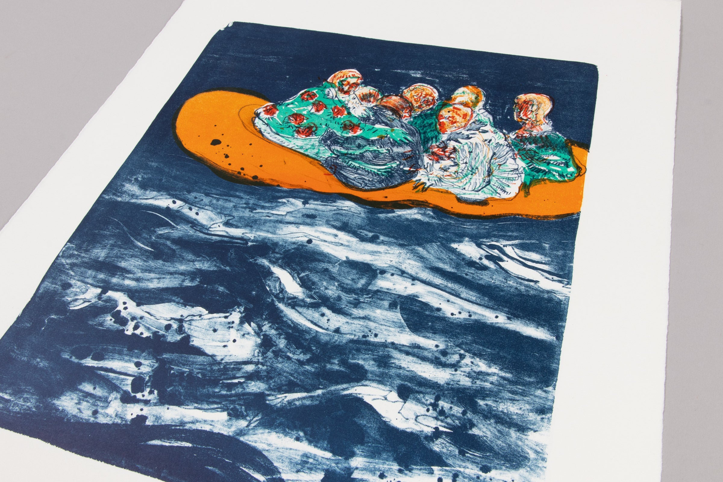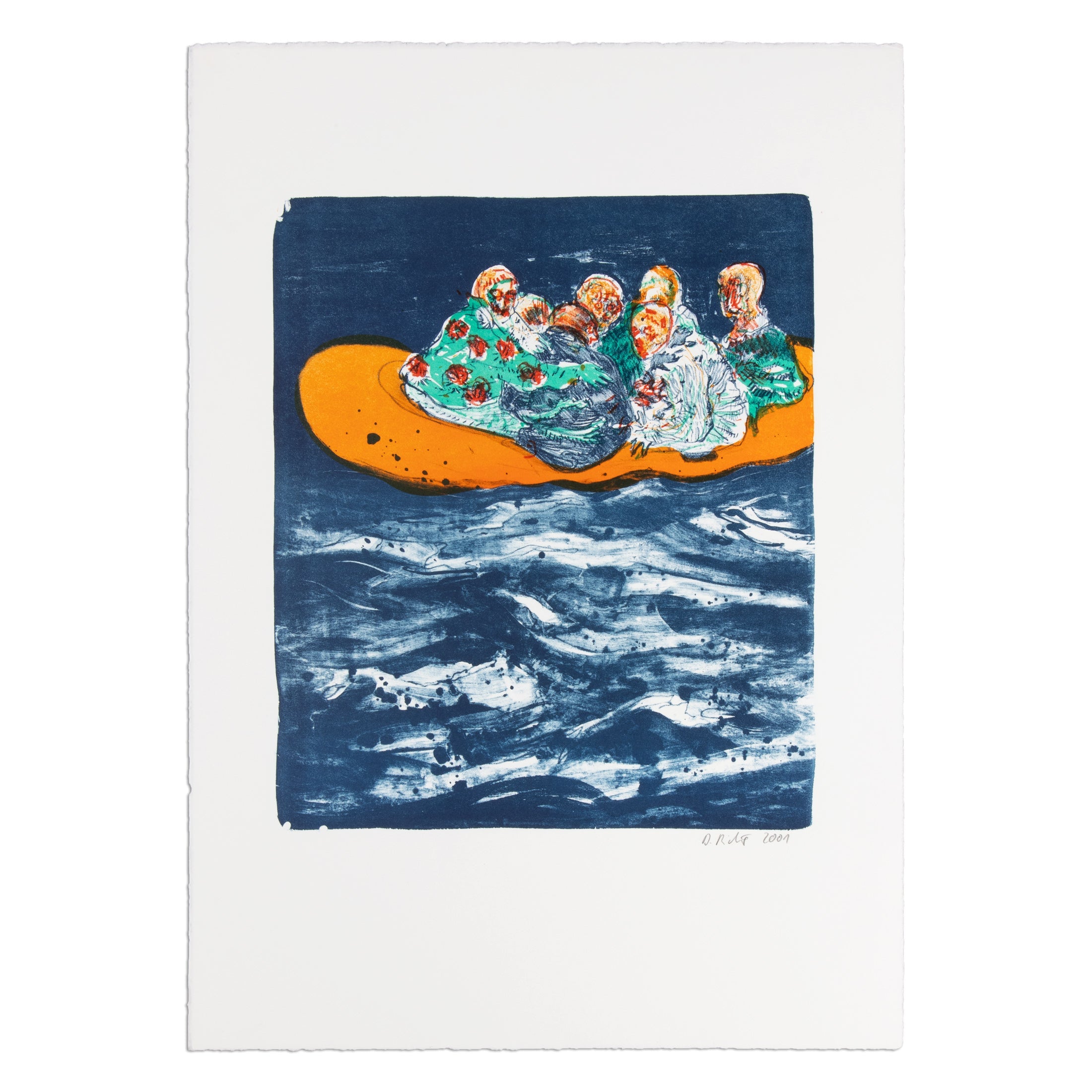 The signed lithograph The Crew (Tarifa) by Daniel Richter from 2001 is closely related to his monumental painting Tarifa of the same year, a key work that marked his decisive shift toward politically charged figuration and firmly positioned him within the field of Political Art . This fine art print shows a group of figures huddled together on a small orange inflatable raft, suspended within a vast, restless expanse of deep blue sea. Derived from press imagery of migrants attempting to reach the Spanish coast, the artwork's composition transforms documentary source material into a stark, painterly vision. Daniel Richter heightens the emotional intensity of this contemporary art print through bold chromatic contrasts. The raft glows in saturated orange against the dark water, while the figures are rendered in acidic greens, reds and chalky whites. Their faces, loosely defined yet confrontational, oscillate between individuality and anonymity. Beneath them, the sea is articulated through sweeping lithographic strokes and splattered marks, with pale, drifting forms visible below the surface, reinforcing a sense of instability and unease. Echoing the tradition of shipwreck imagery while rejecting romantic heroism, The Crew (Tarifa) presents a contemporary scene of collective vulnerability. Through expressive color and gestural draftsmanship, Daniel Richter condenses a moment of crisis into a powerful, emblematic image within the medium of lithography.