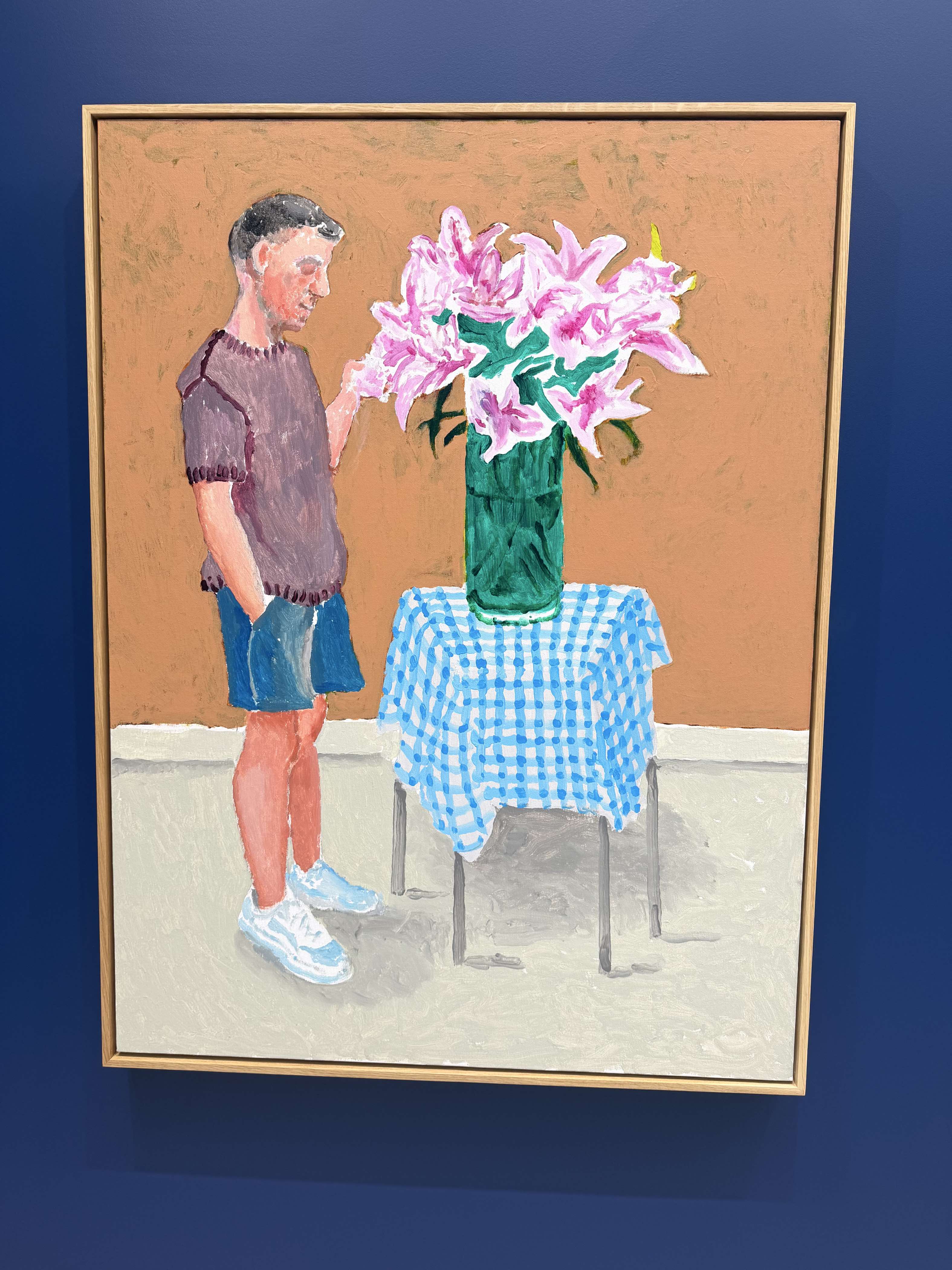 This vibrant figurative painting depicts a young man in a purple t-shirt and blue shorts reaching toward a large bouquet of pink lilies arranged in a tall green glass vase atop a blue and white gingham tablecloth. The warm terracotta background and luminous grey floor create a characteristic Hockney domestic intimacy. The work exemplifies Hockney's lifelong engagement with flowers, interiors, and the human figure rendered in bold flat color and confident brushwork. Spotted at the National Gallery, this painting represents Hockney's mature style of joyful observational painting.