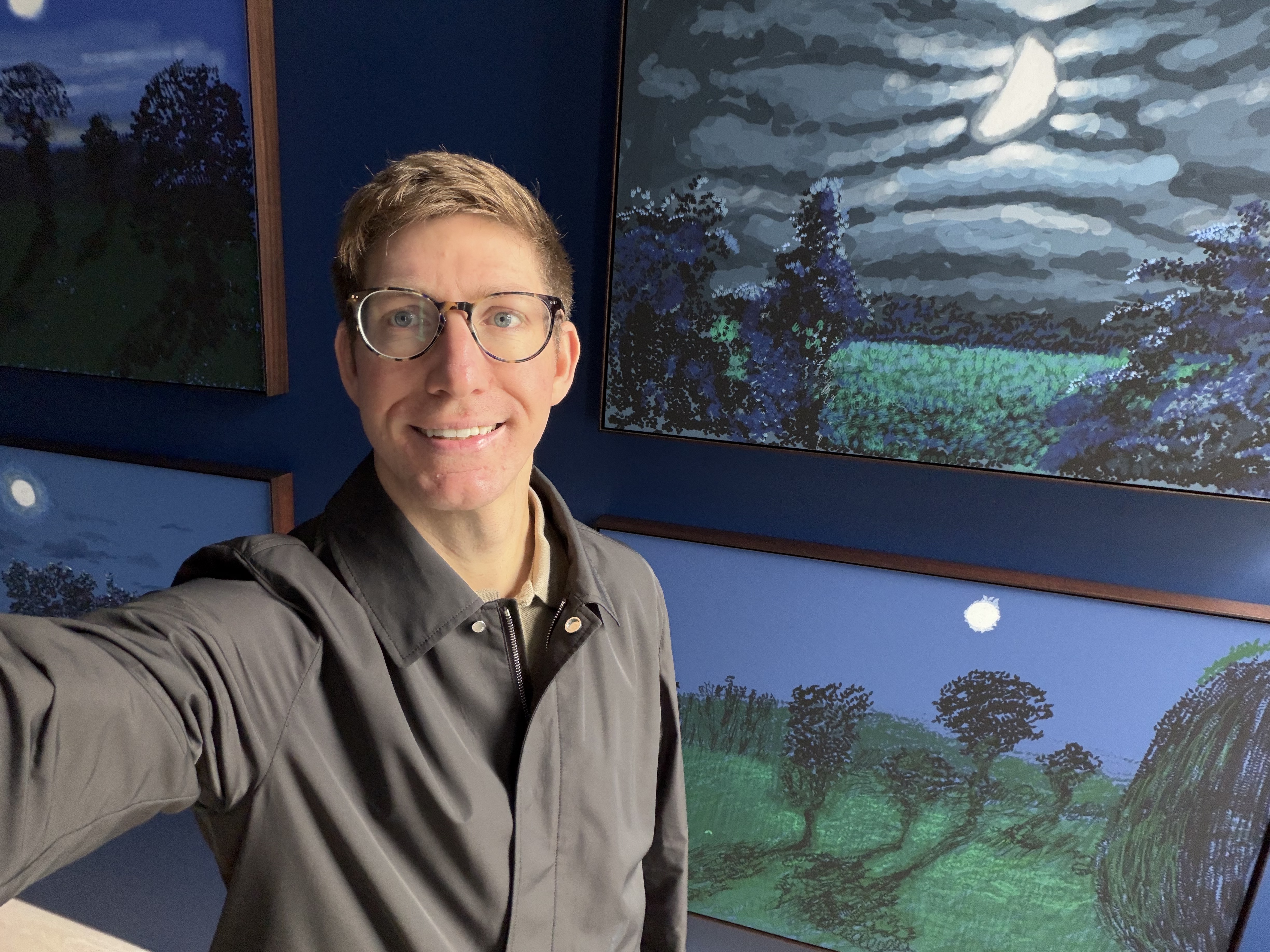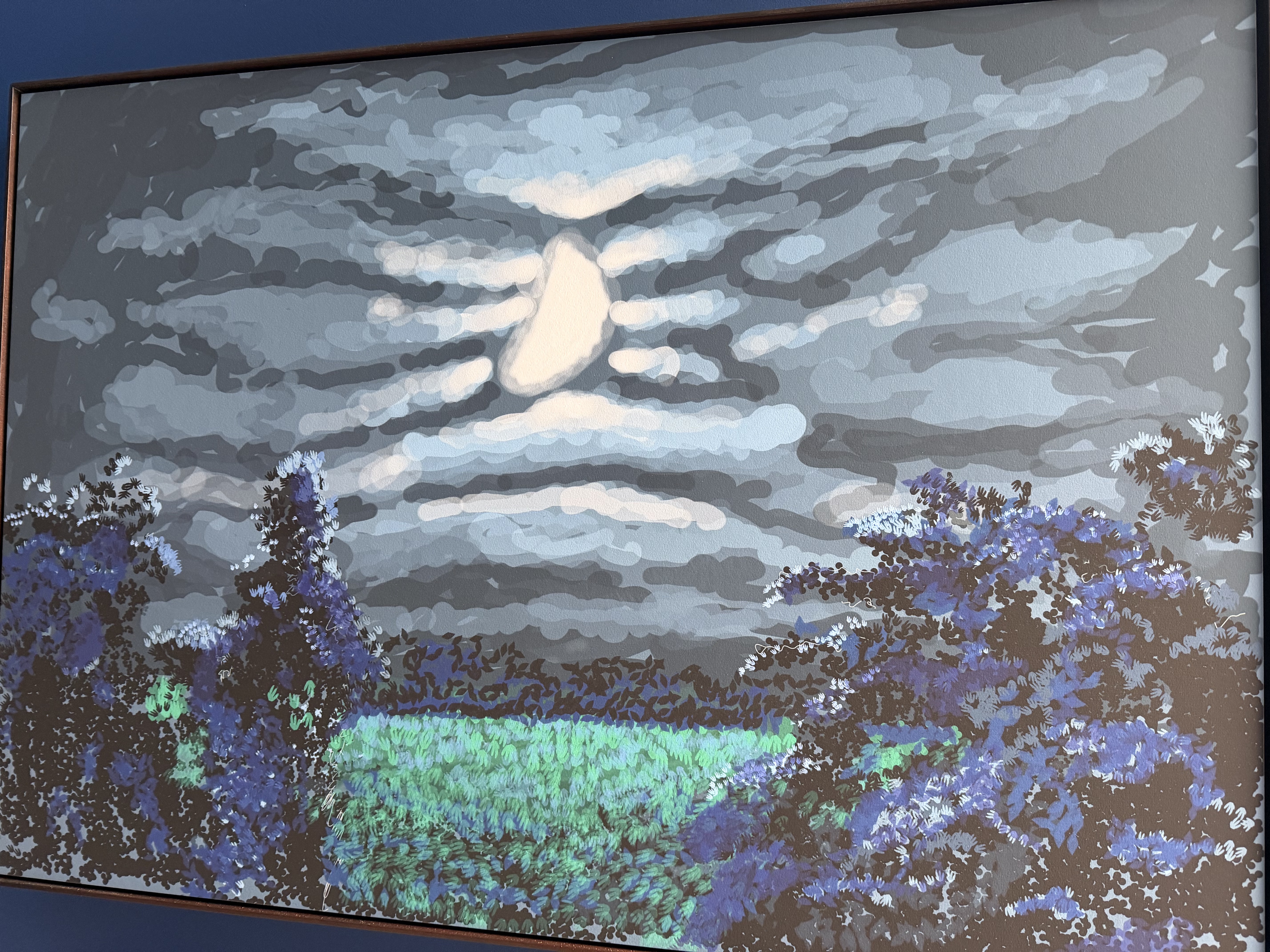 This luminous nocturnal landscape by David Hockney captures a crescent moon breaking through dramatic clouds above a green field framed by dark blue trees. Created during the 2020 lockdown as part of Hockney's prolific iPad painting series documenting the changing seasons in Normandy. Part of a limited edition of 15, published by Galerie Lelong.