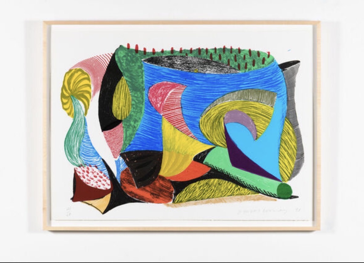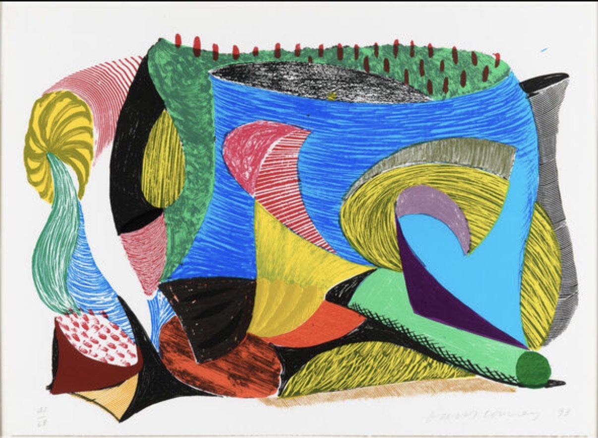 A vibrantly colorful 35-color screenprint by David Hockney, part of the celebrated 'Some More New Prints' series from 1993. The composition features dynamic, interlocking biomorphic forms rendered in bold hues of blue, green, yellow, red, and black with characteristic hatched line work. Hand-signed, dated, and numbered by the artist in pencil in the lower margin, this work is from a limited edition of 68. Presented in its original frame with a Certificate of Authenticity issued by the gallery.