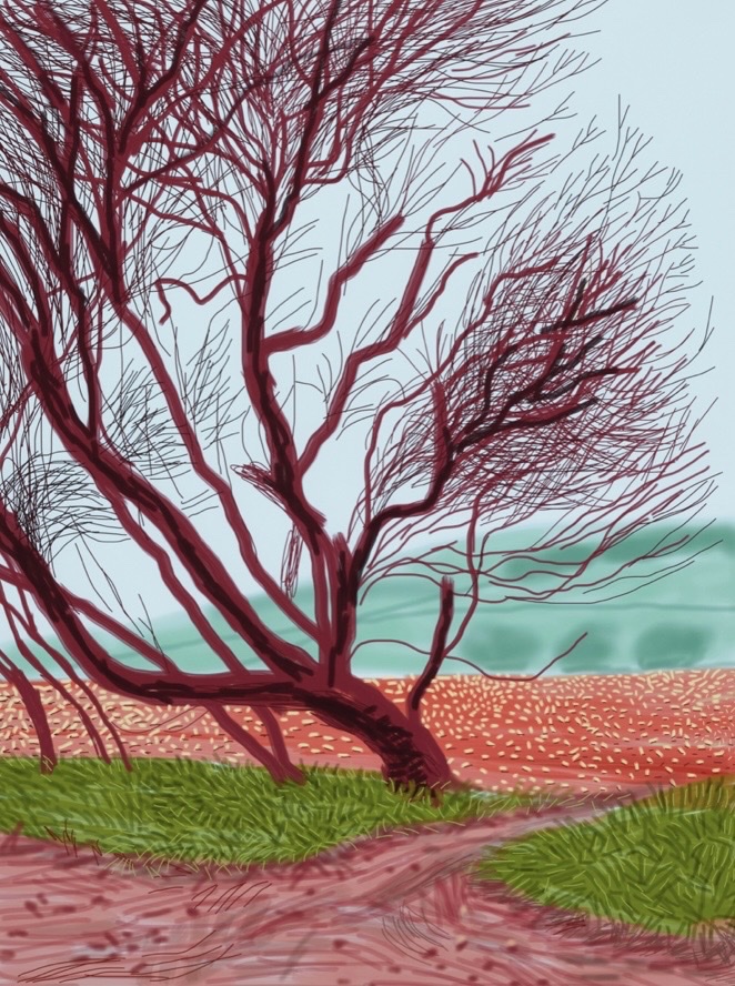 A characteristically vivid iPad drawing by David Hockney depicting a bare, wind-swept tree with deep crimson-burgundy branches set against a pale blue sky and layered landscape of green, orange, and teal tones. The work is part of Hockney's celebrated 'The Arrival of Spring' series, in which he used his iPad to capture the seasonal transformation of the East Yorkshire landscape in near-daily drawings. The composition exemplifies Hockney's mastery of color and mark-making transposed into the digital medium, retaining an intimate, hand-drawn quality that collectors prize across the series.