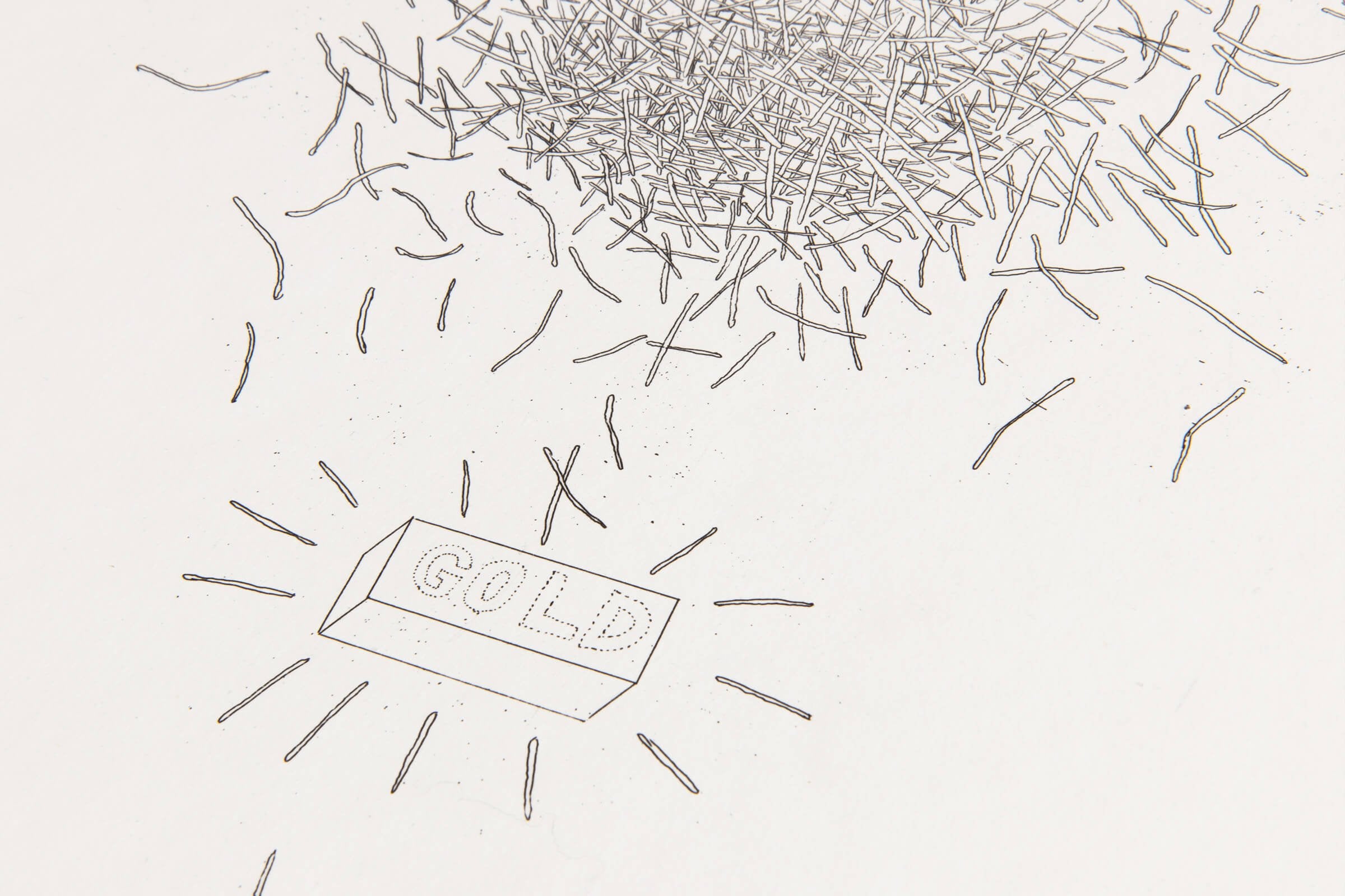 David Hockney ’s Gold (1969) is a signed etching and aquatint from the celebrated series Six Fairy Tales from the Brothers Grimm , widely regarded as one of the most important graphic projects of his early career. This fine art print visualizes a key moment from the tale of Rumpelstilzchen, where strands of straw appear to descend and transform into shimmering gold, rendered through Hockney’s precise yet delicate linework. Rather than illustrating the narrative literally, Hockney distills the scene into a conceptual image, using fine etched marks and subtle tonal variation to suggest movement, transformation, and luminosity. The restrained composition reflects his interest in clarity, storytelling, and the expressive potential of printmaking. Created as part of a group of 39 etchings, this limited edition print belongs to a series inspired by six Grimm fairy tales that captivated Hockney since childhood. The project is notable for its intellectual rigor and its balance between literary reference and visual abstraction. Executed on handmade paper and issued in a limited edition of 100, hand-signed and numbered in pencil, Gold is a highly collectible example of David Hockney’s graphic work and a significant piece of contemporary printmaking history.