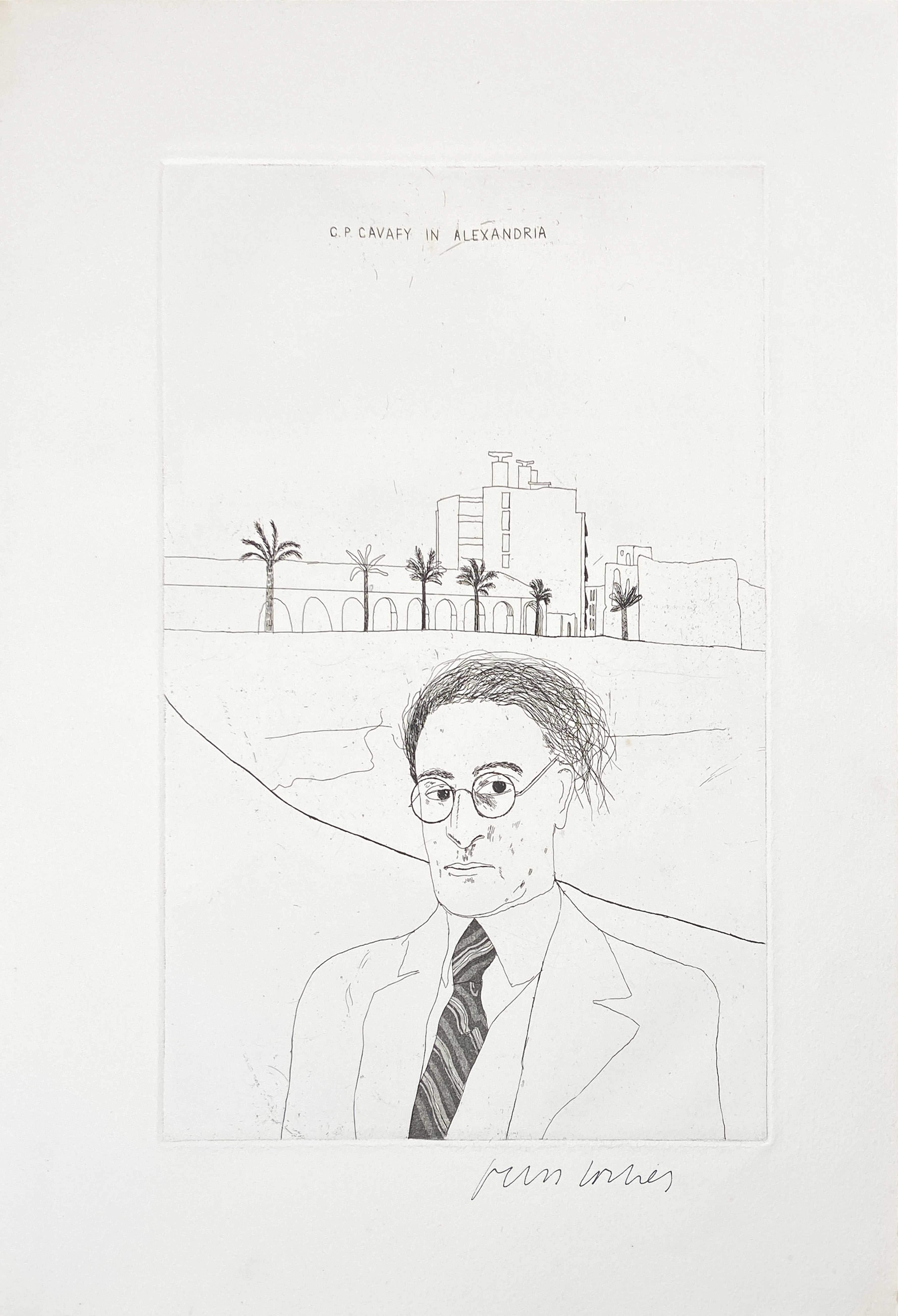 This etching and aquatint demonstrates Hockney's early mastery of printmaking techniques while exploring literary themes through his distinctive linear style. Part of a portfolio illustrating the Greek poet's work, the piece reflects Hockney's fascination with Mediterranean culture and his ability to translate poetic narrative into visual form through precise draftsmanship.
